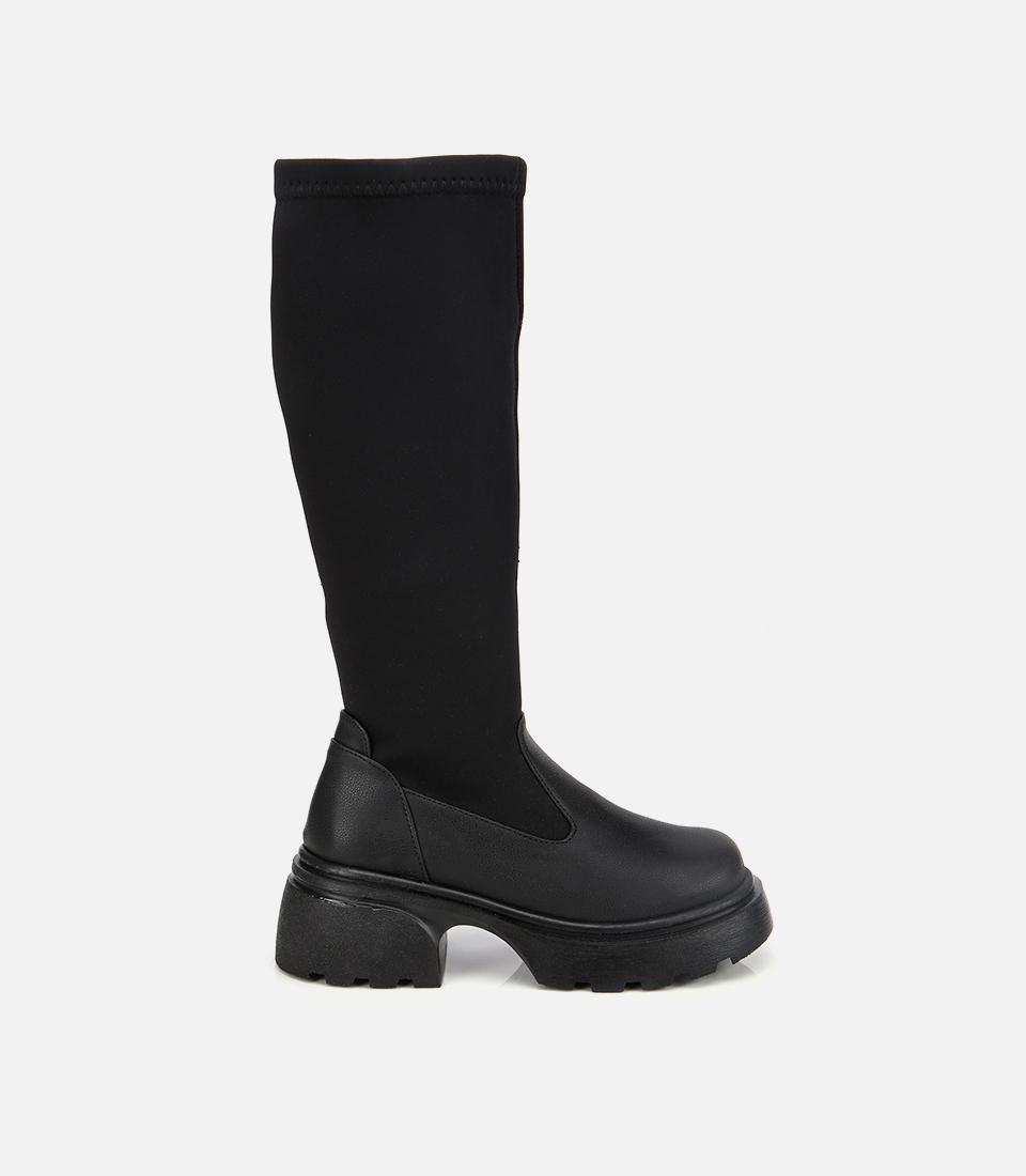 Kadın Siyah Streç Kalın Tabanlı Düz Çizme