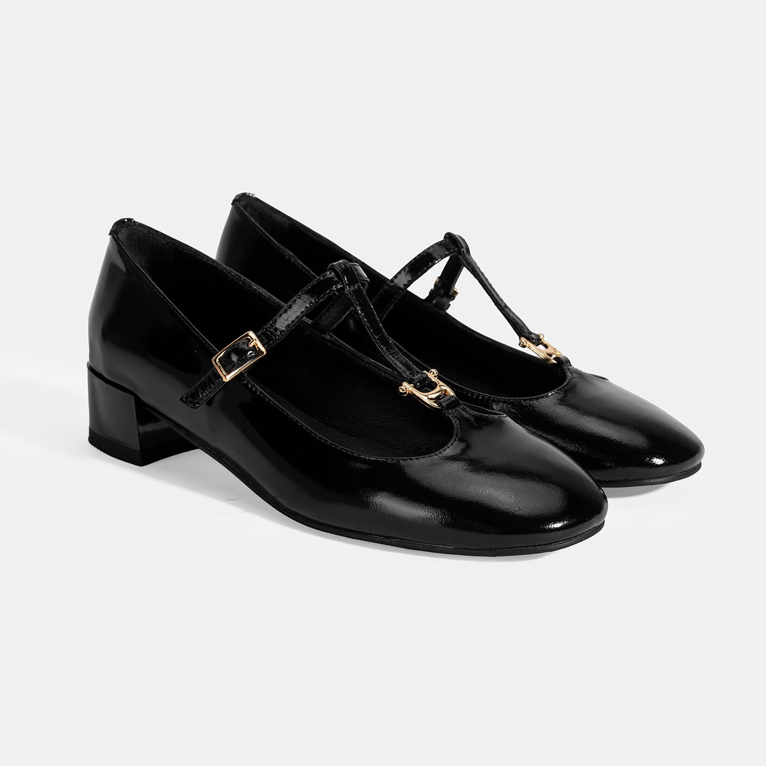 Kadın Siyah Toka Aksesuarlı T-Bant Rugan Topuklu Babet