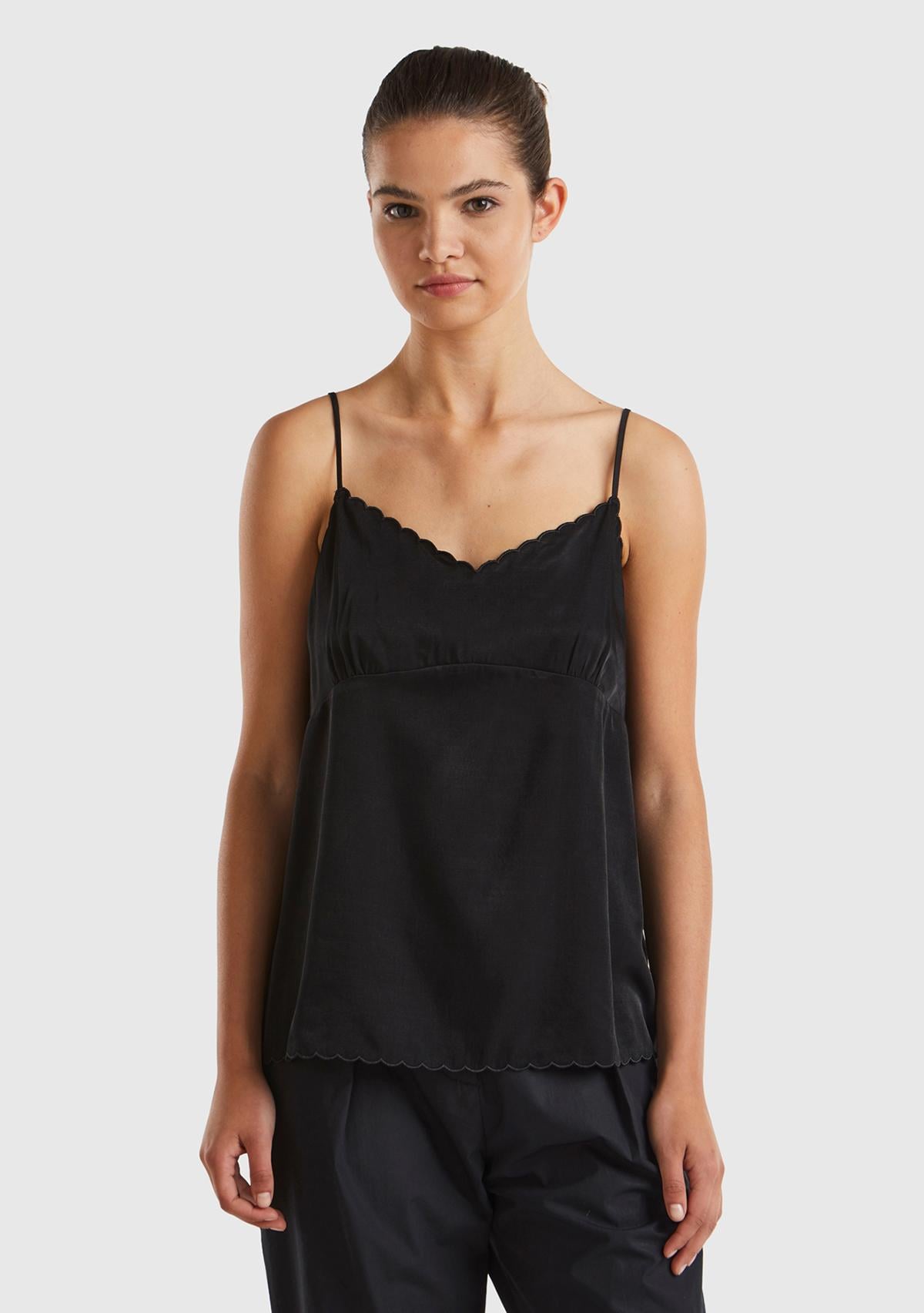 Kadın Siyah Viskon Karışımlı Göğsü ve Etek Ucu Fırfırlı İnce Askılı Bluz