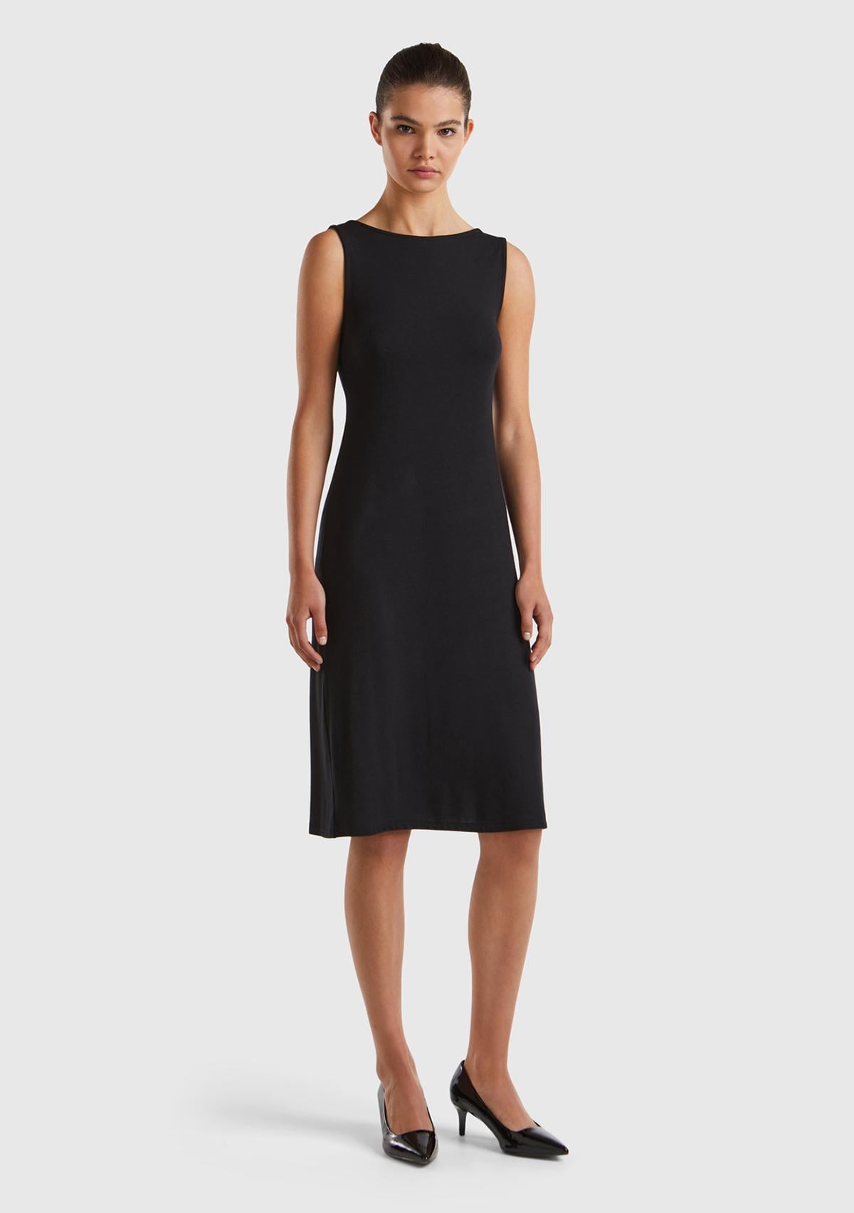 Kadın Siyah Viskoz Karışımlı Arkası Üçgen ve Düğüm Detaylı Kolsuz Elbise
