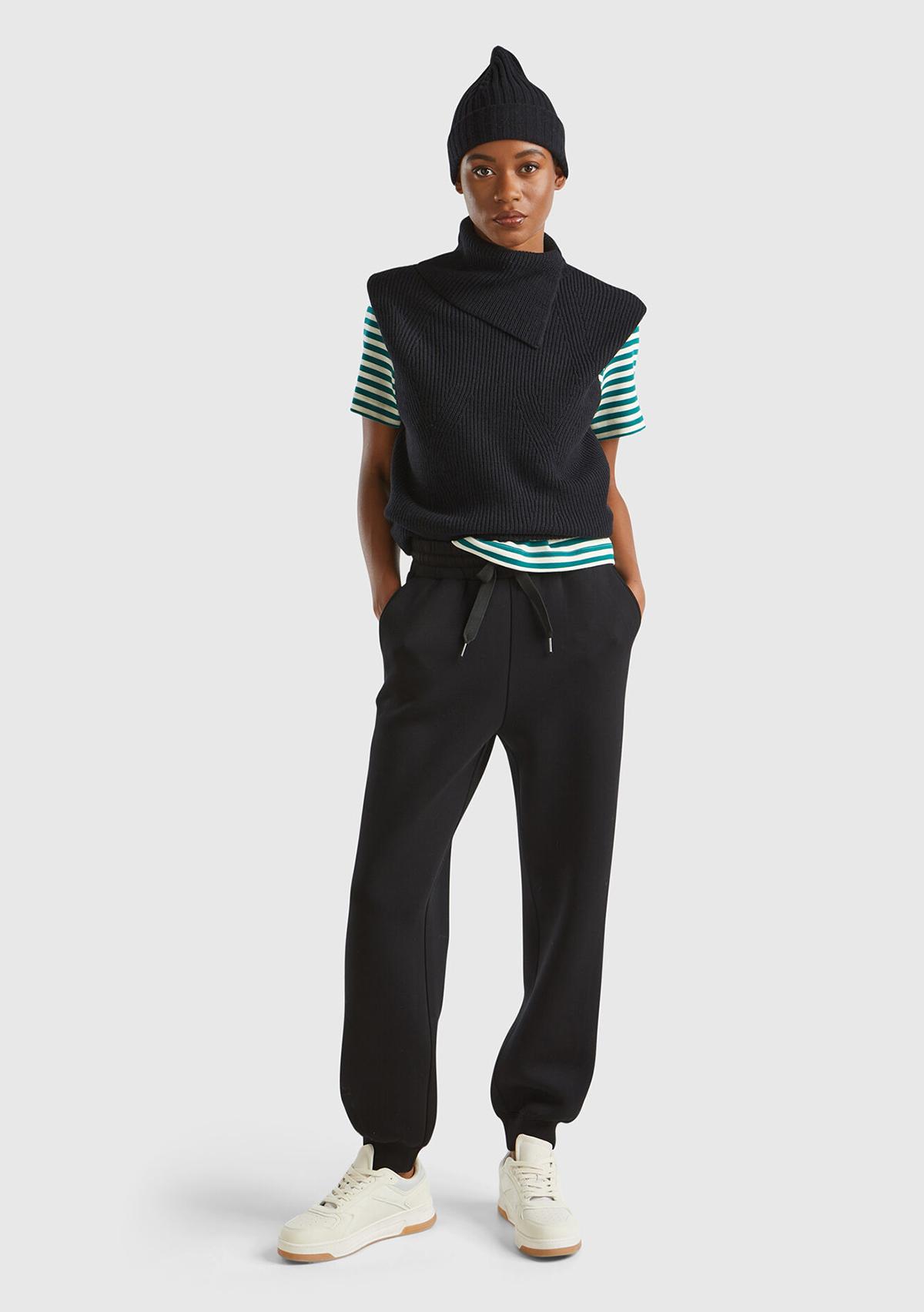 Kadın Siyah Viskoz Karışımlı Beli Lastikli Büzgü İpli Manşetli Eşofman Altı