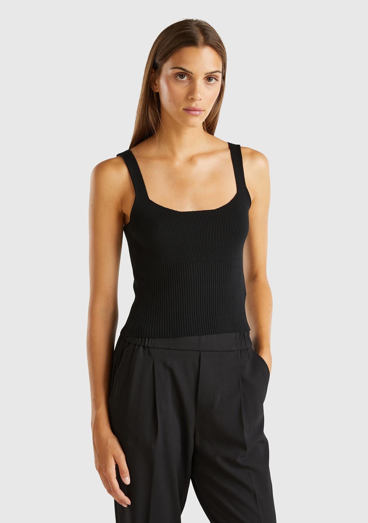 Kadın Siyah Viskoz Karışımlı Nervür Detaylı Kare Yaka Askılı Üst