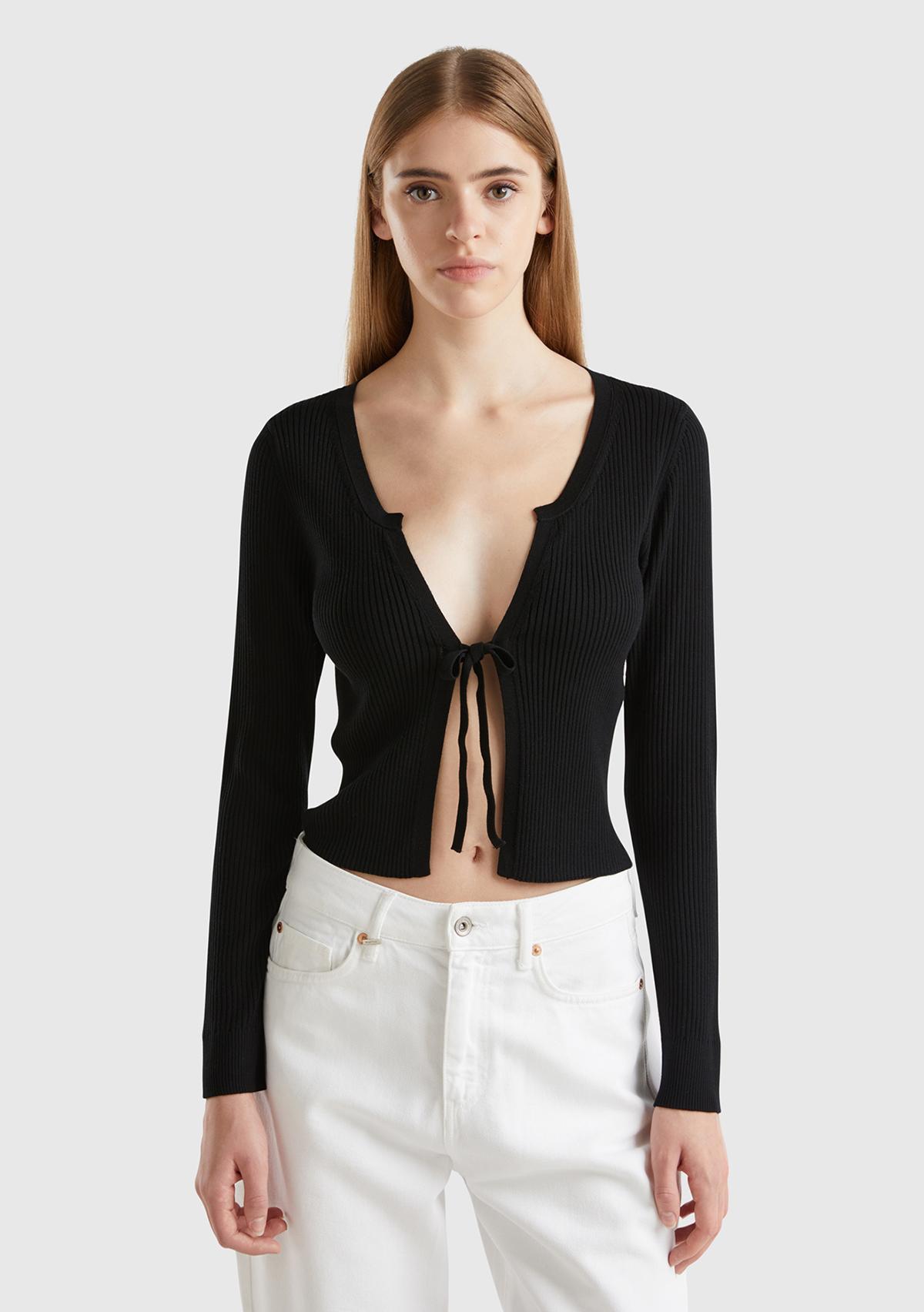 Kadın Siyah Viskoz Karışımlı Önü Bağlama Detaylı Geniş V Yaka Hırka