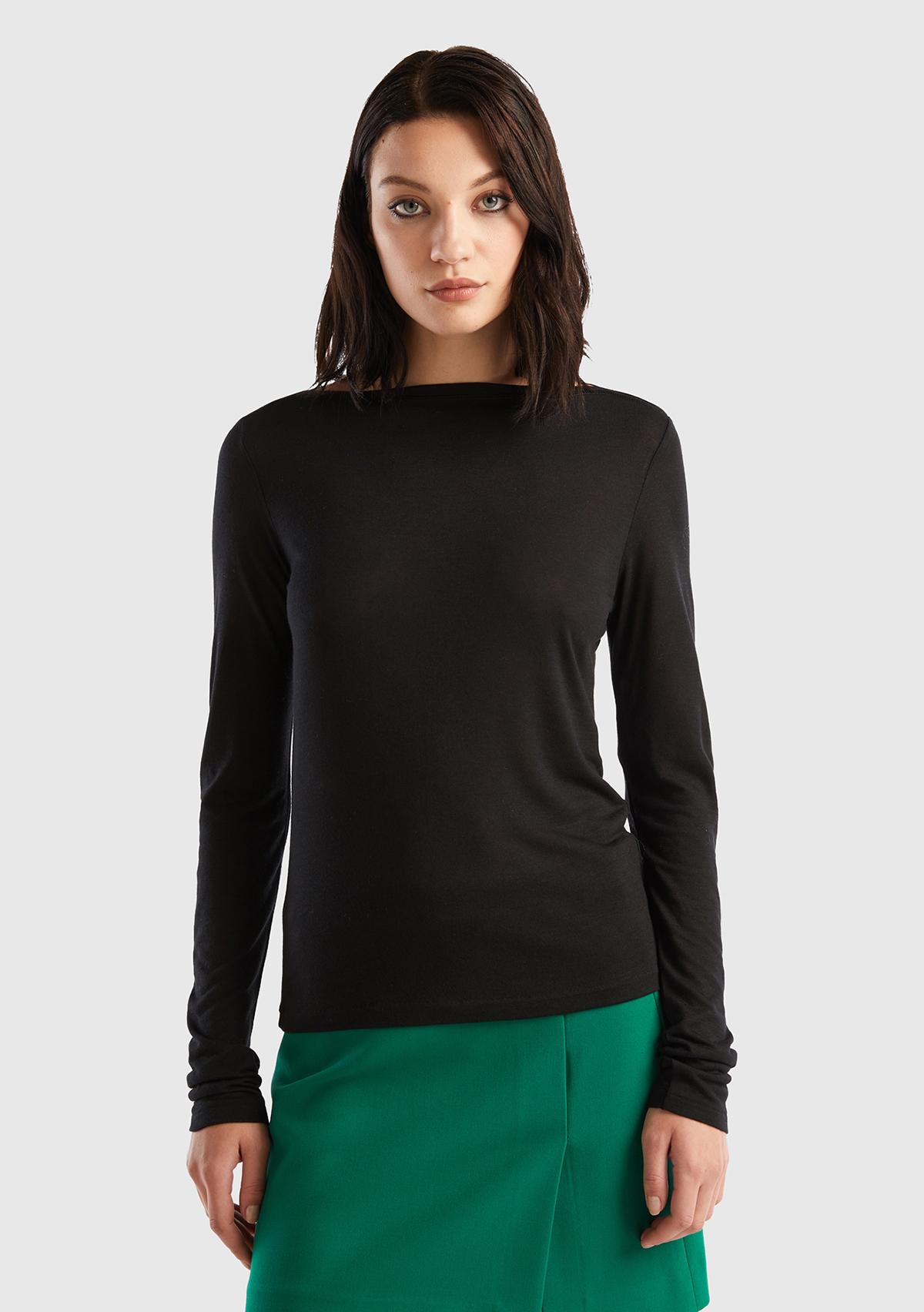 Kadın Siyah Viskoz/Yün Karışımlı Uzun Kollu Kayık Yaka T-Shirt