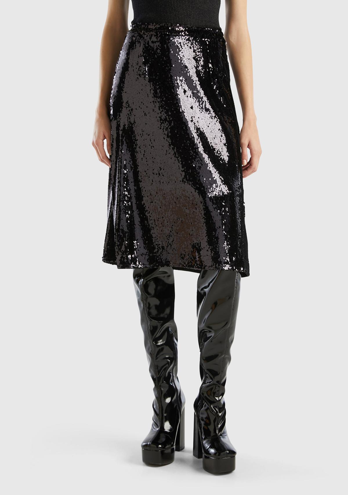 Kadın Siyah Yandan Fermuarlı Astarlı Payetli Midi Boy Etek