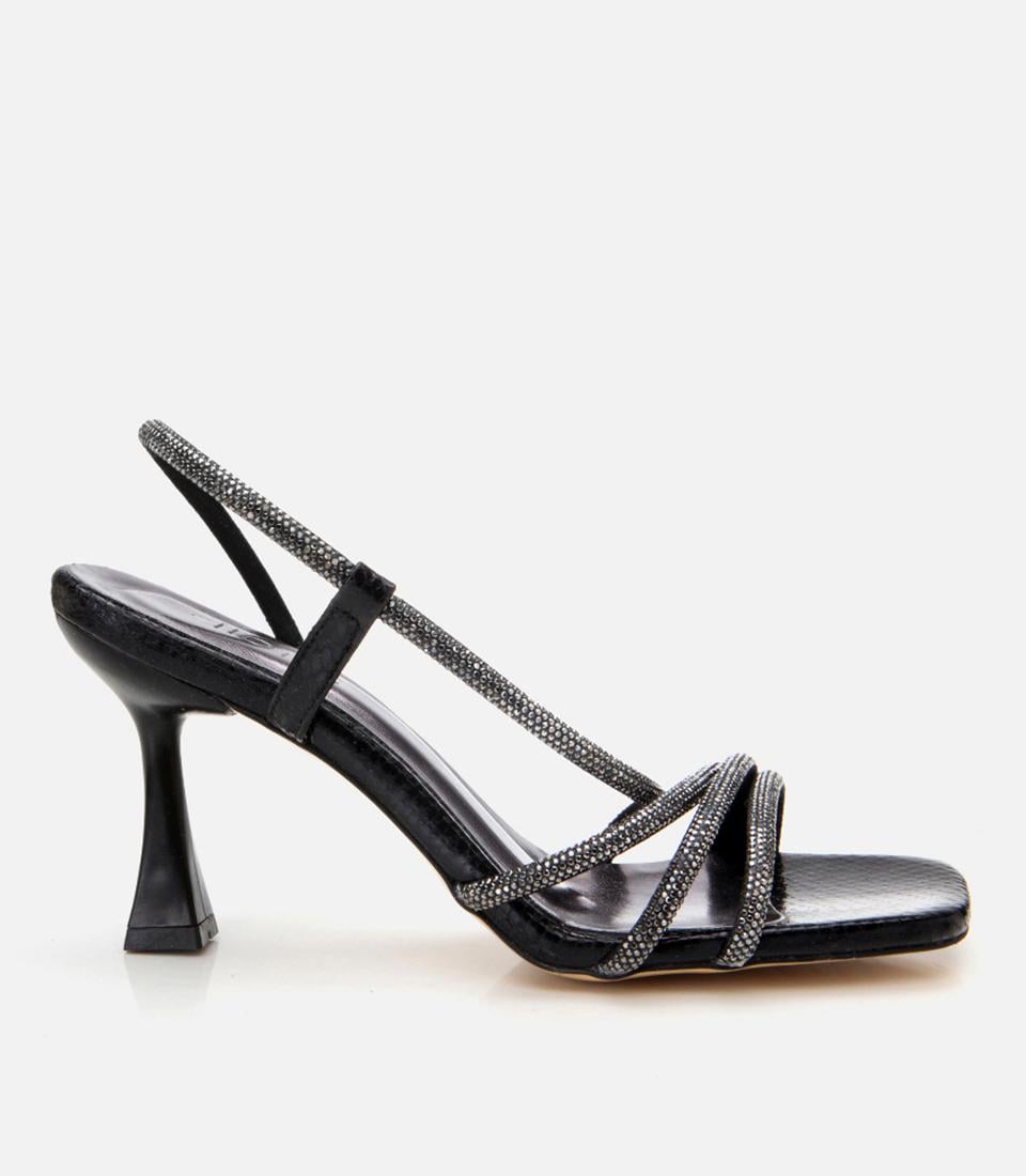 Kadın Siyah Yılan Desenli Taşlı Abiye Topuklu Sandalet