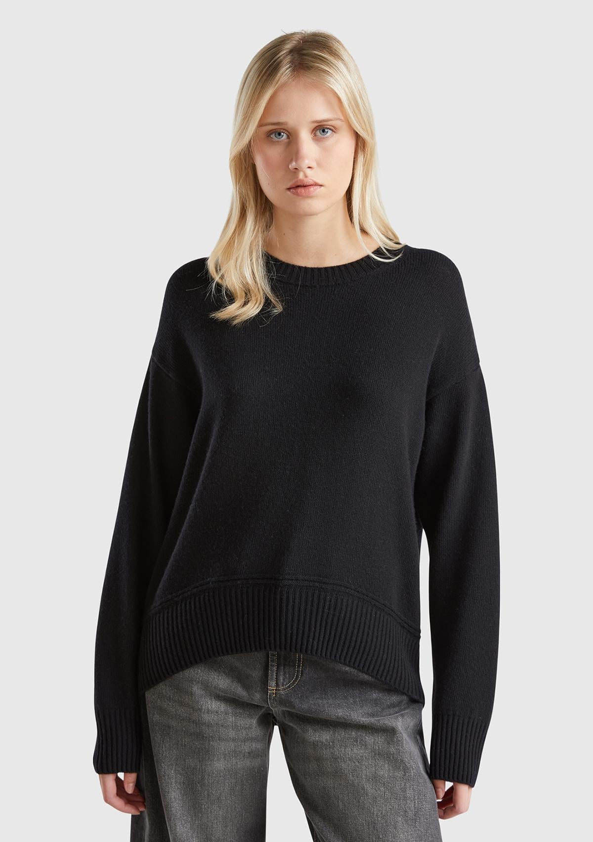 Kadın Siyah Yün Karışımlı Alt Kısmı Geniş Bisiklet Yaka Kazak. Koyun Yünü İçerir