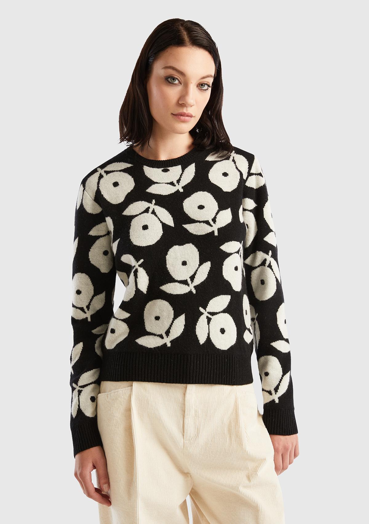 Kadın Siyah Yün Karışımlı Çiçek Desenli Kazak. Koyun Yünü İçerir