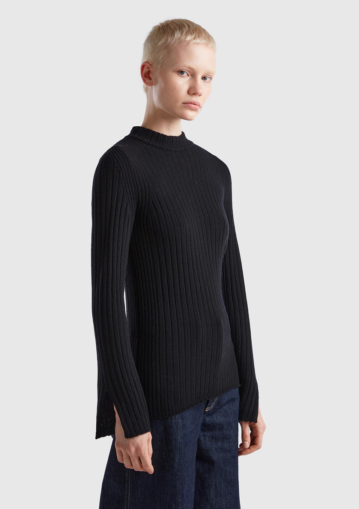 Kadın Siyah Yün Karışımlı Kol Ucu Yırtmaçlı Yarım Balıkçı Kazak. Koyun Yünü İçerir