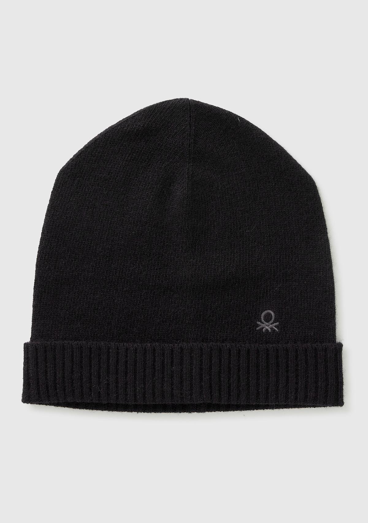Kadın Sİyah Yün ve Kaşmir Karışımlı Önü Logo Detaylı Ribana Detaylı Bere
