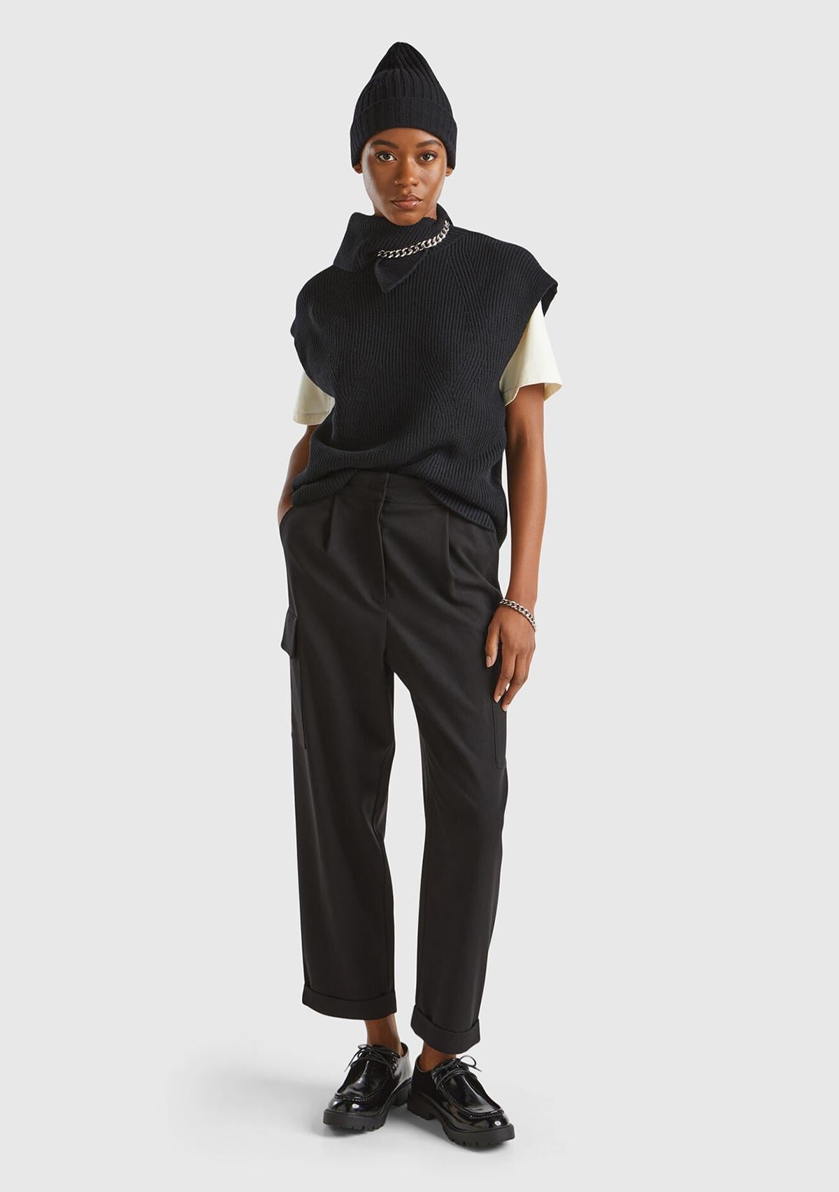 Kadın Siyah Yün ve Liyosel Karışımlı Cepli Yüksek Bel Kargo Pantolon