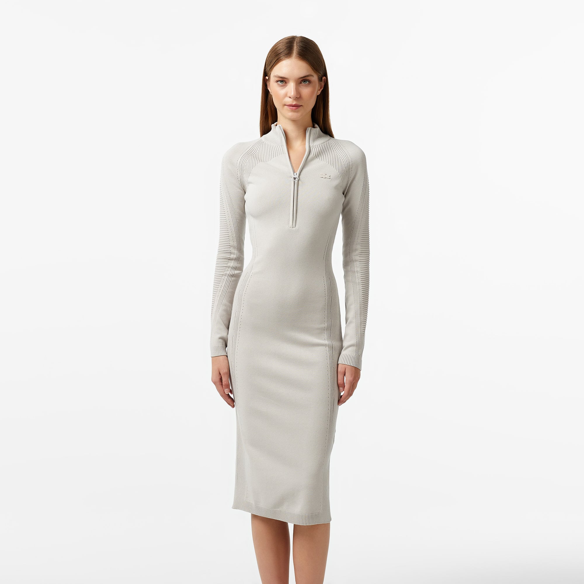 Kadın Slim Fit Uzun Kollu Yarım Fermuarlı Gri Elbise