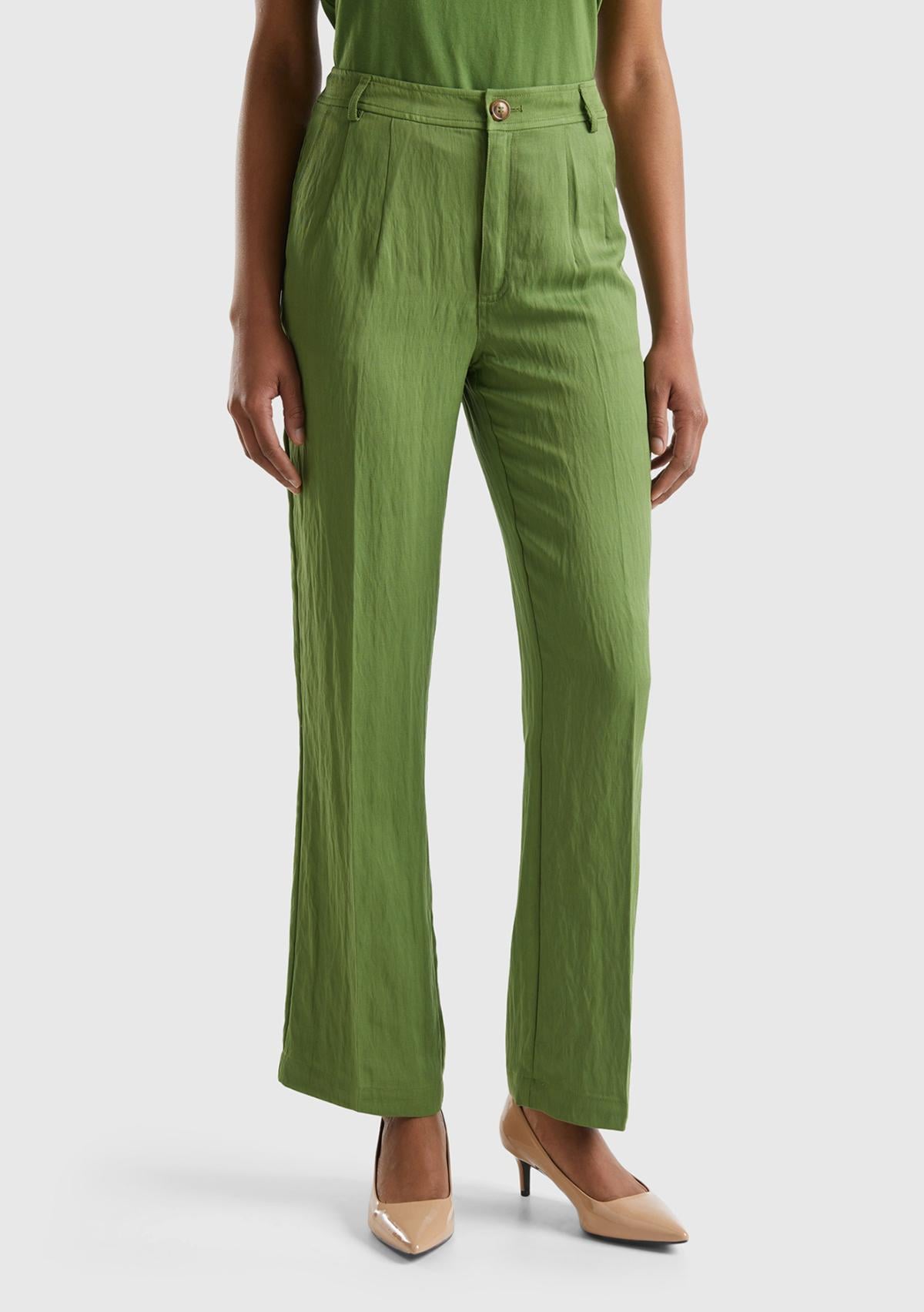 Kadın Soluk Yeşil Liyosel Karışımlı Çift Pileli Pantolon