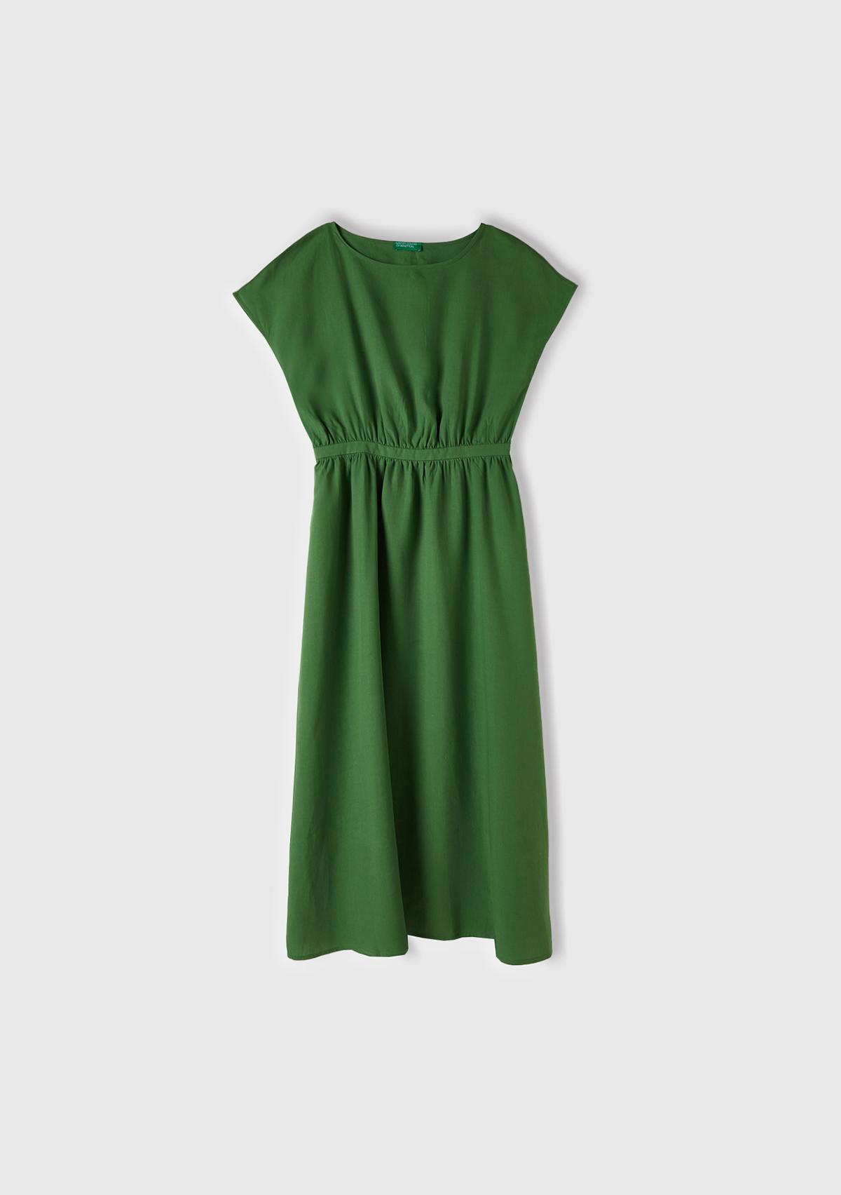 Kadın Soluk Yeşil Liyosel ve Keten Karışımlı Beli Büzgülü Kayık Yaka Elbise