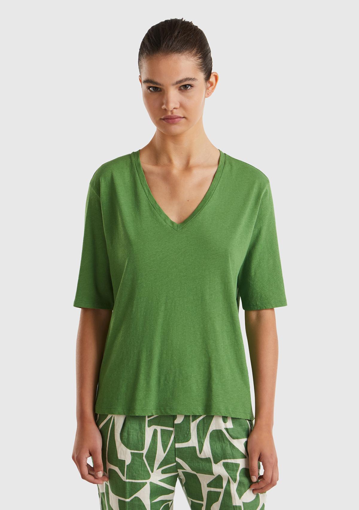 Kadın Soluk Yeşil Pamuk Keten Karışımlı V Yaka Rahat Kesim T-Shirt