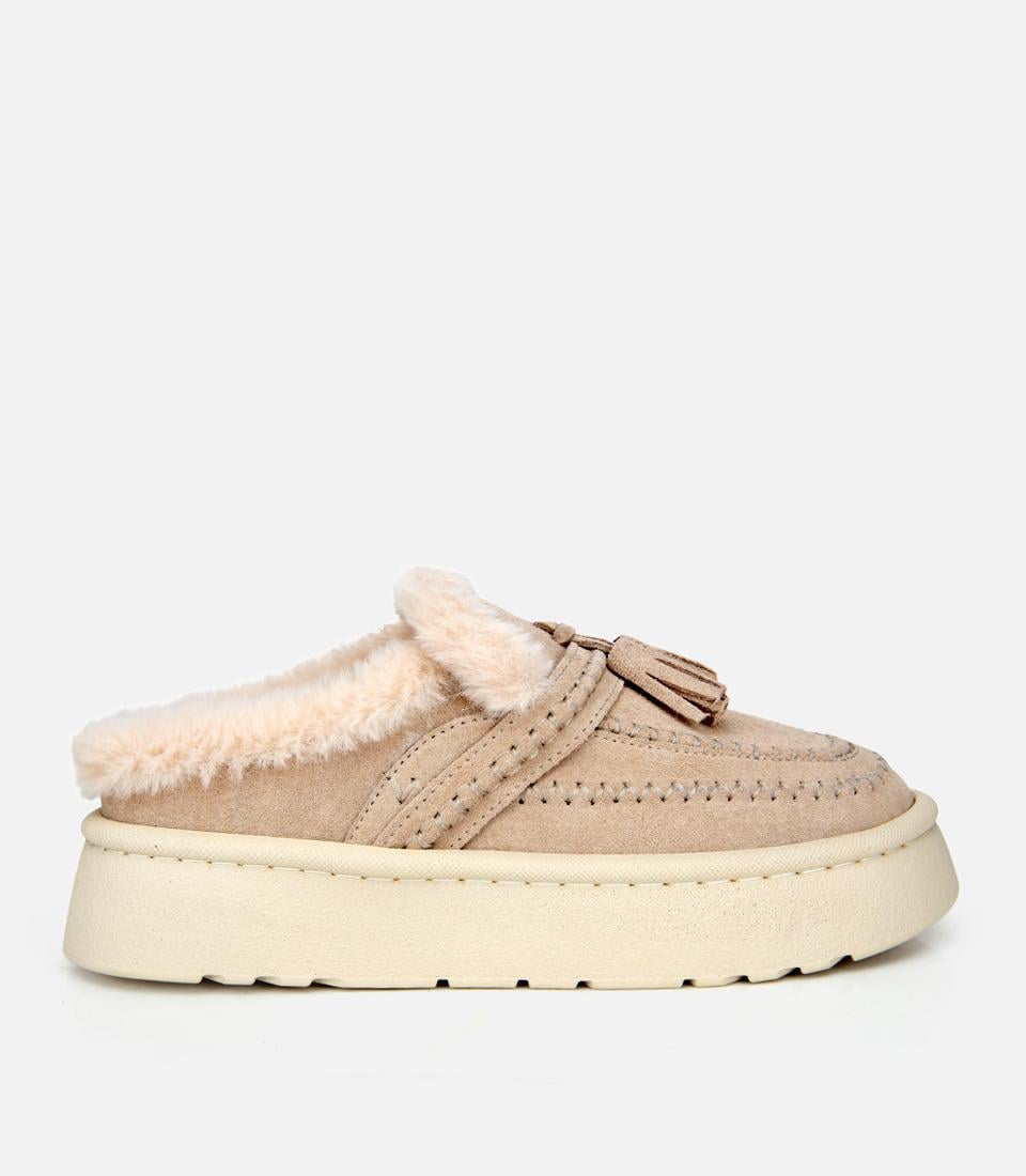 Kadın Süet Deri Bej İçi Kürklü Püskül Detaylı Düz Terlik