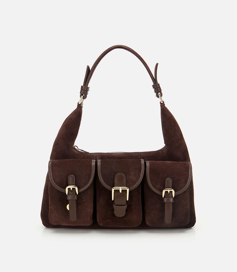 Kadın Süet Deri Kahverengi Cepli Tokalı Omuz Çantası