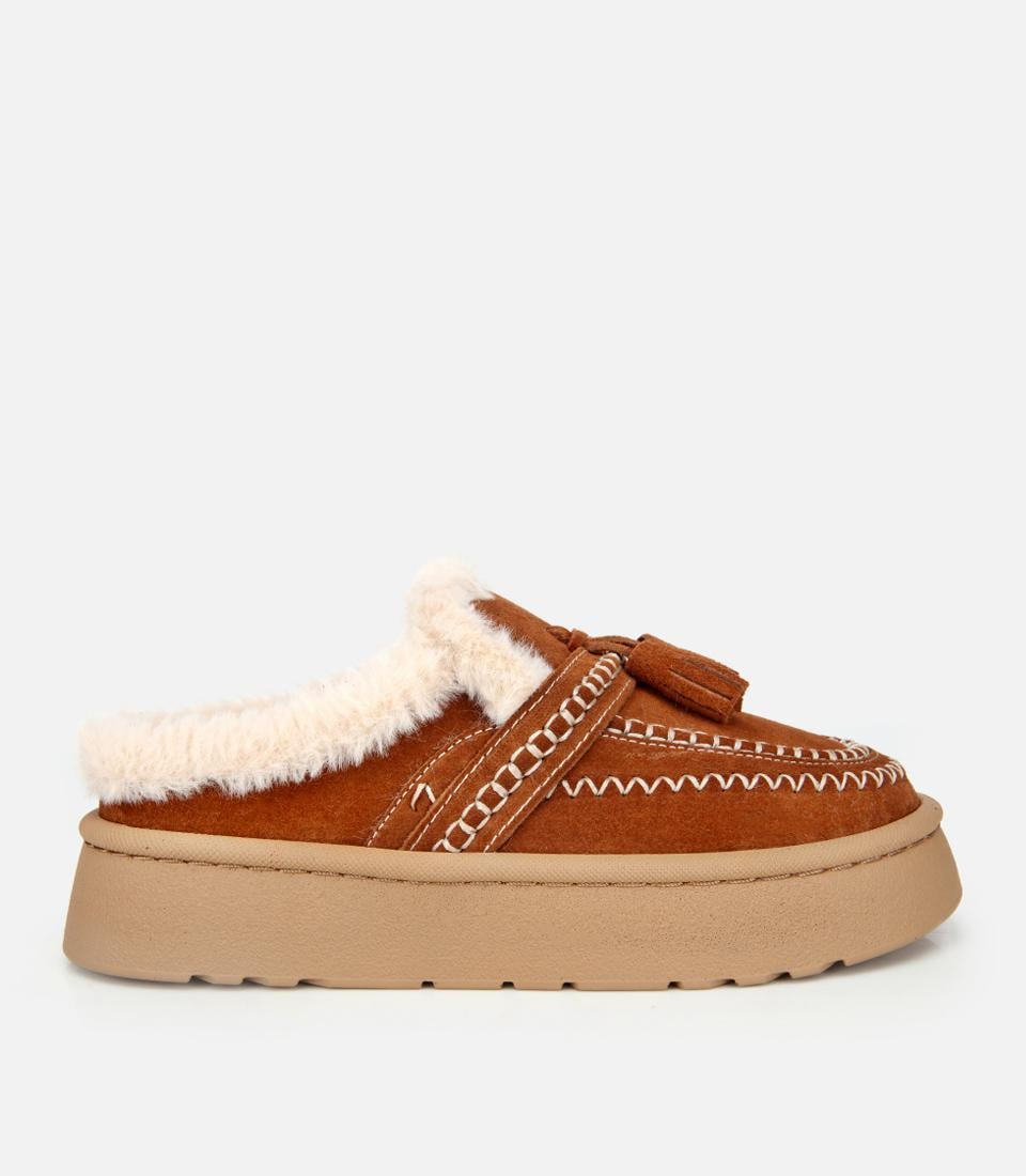 Kadın Süet Deri Kahverengi İçi Kürklü Püskül Detaylı Düz Terlik