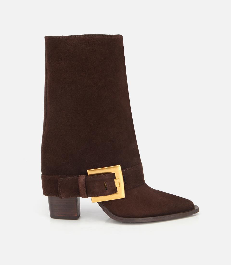 Kadın Süet Deri Kahverengi Pantolon Görünümlü Gold Tokalı Topuklu Bot