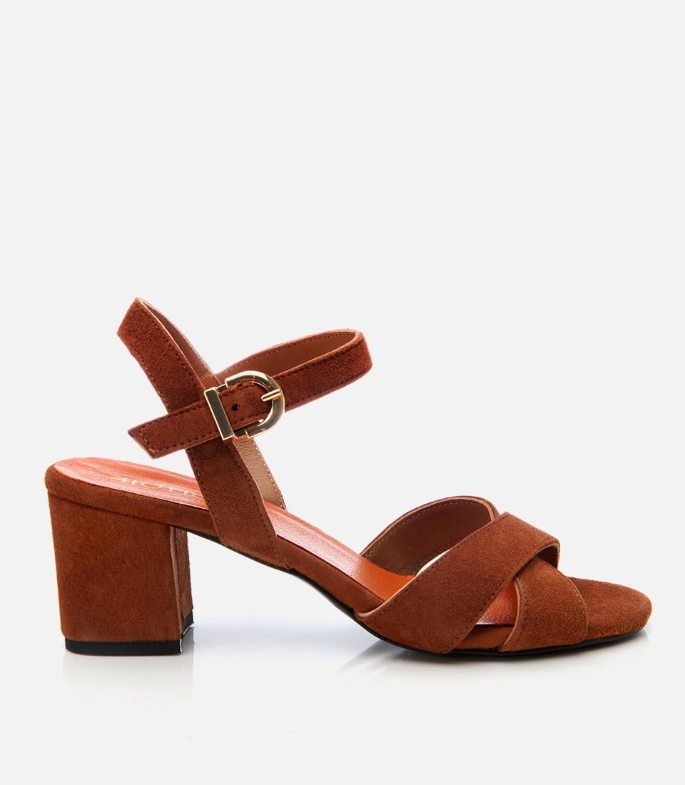 Kadın Süet Deri Taba Kemerli Kalın Topuklu Sandalet