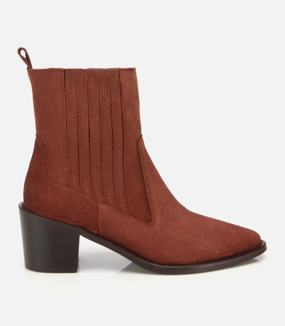Kadın Süet Deri Taba Sivri Burunlu Lastik Detaylı Topuklu Bot