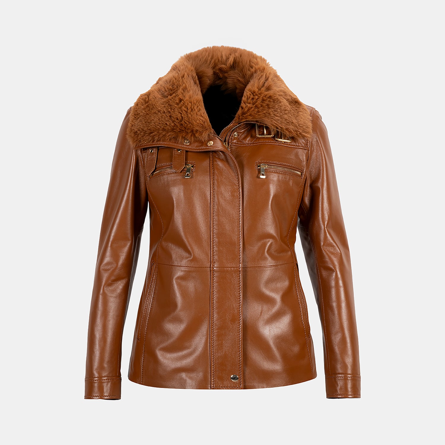 Kadın yüksek hakim yakalı deri ceket. Yakasında iki adet, toka ile kapanan bantlı detayı bulunmaktadır. Kürk görünümlü yaka çıkarılabilir özelliktedir. Önden metal gizli çıtçıtlı ve fermuar kapamalıdır. Önde iki adet yandan girişli fleto cebi ve ön üstte iki adet metal fermuarlı cebi bulunmaktadır. Ürün üzerinde ön ve arka omuzda dekoratif kapitone dikiş detayları kullanılmıştır. Günlük kullanım için oldukça uygun ve fit kalıplıdır. %100 koyun derisinden olup elyaf, kapitone desenli astarlı çalışılmıştır.-Kadın yüksek hakim yakalı deri ceket. Yakasında iki adet, toka ile kapanan bantlı detayı bulunmaktadır. Kürk görünümlü yaka çıkarılabilir özelliktedir. Önden metal gizli çıtçıtlı ve fermuar kapamalıdır. Önde iki adet yandan girişli fleto cebi ve ön üstte iki adet metal fermuarlı cebi bulunmaktadır. Ürün üzerinde ön ve arka omuzda dekoratif kapitone dikiş detayları kullanılmıştır. Günlük kullanım için oldukça uygun ve fit kalıplıdır. %100 koyun derisinden olup elyaf, kapitone desenli astarlı çalışılmıştır.