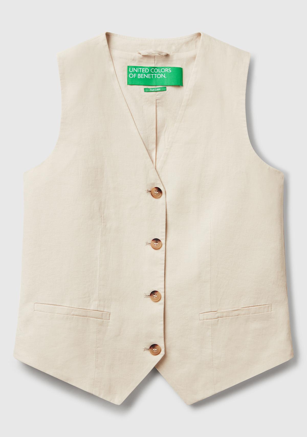 Kadın Taş Rengi %100 Keten Önü Düğme İliklemeli V Yaka Yelek