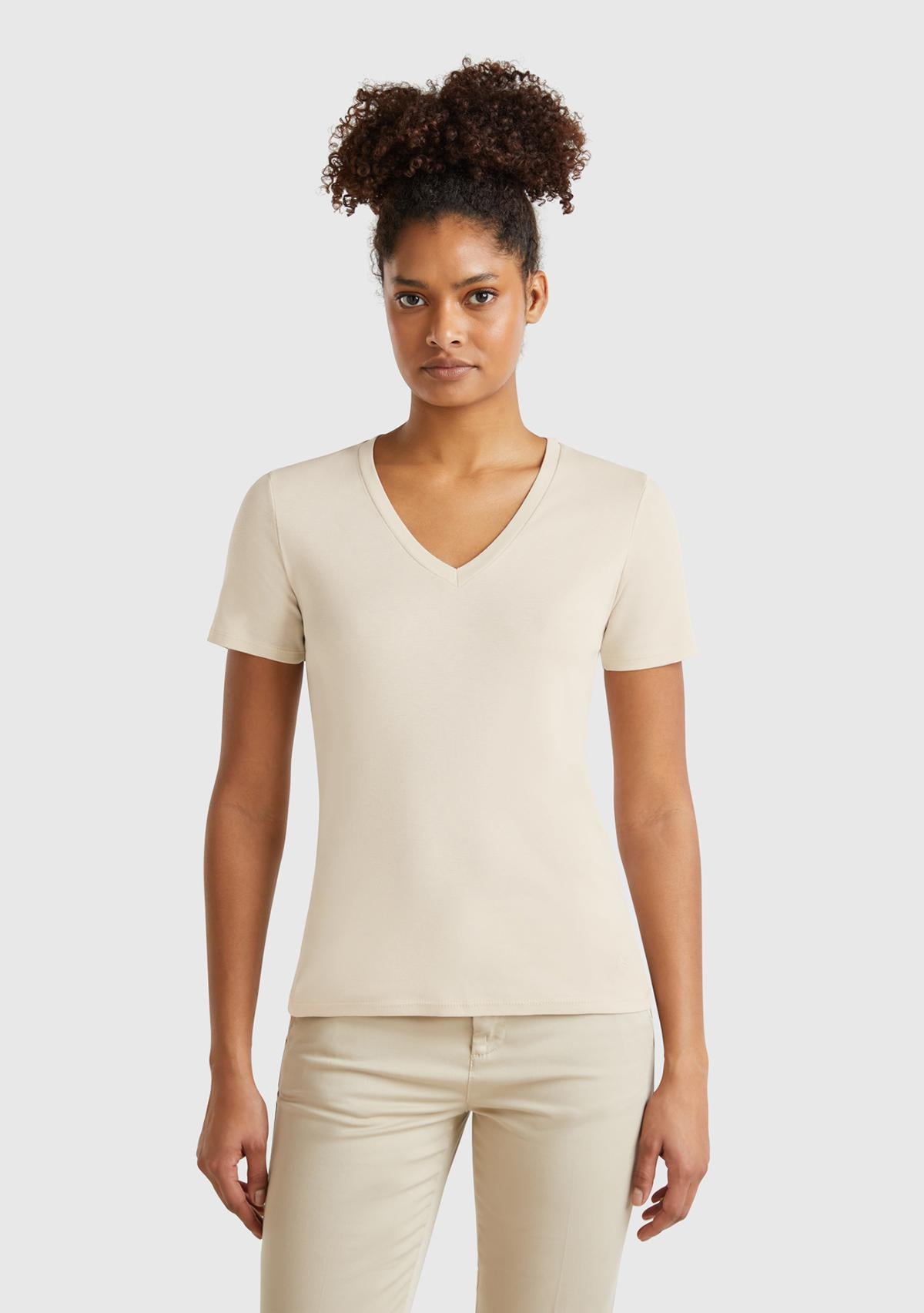 Kadın Taş Rengi %100 Pamuk V Yaka Basic T-Shirt