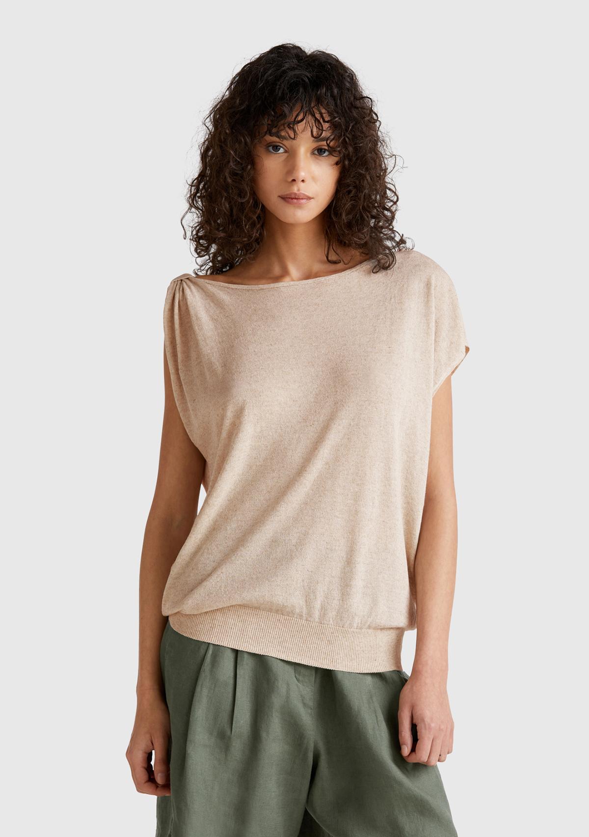 Kadın Taş Rengi Keten Karışımlı Asimetrik Kolsuz Kazak