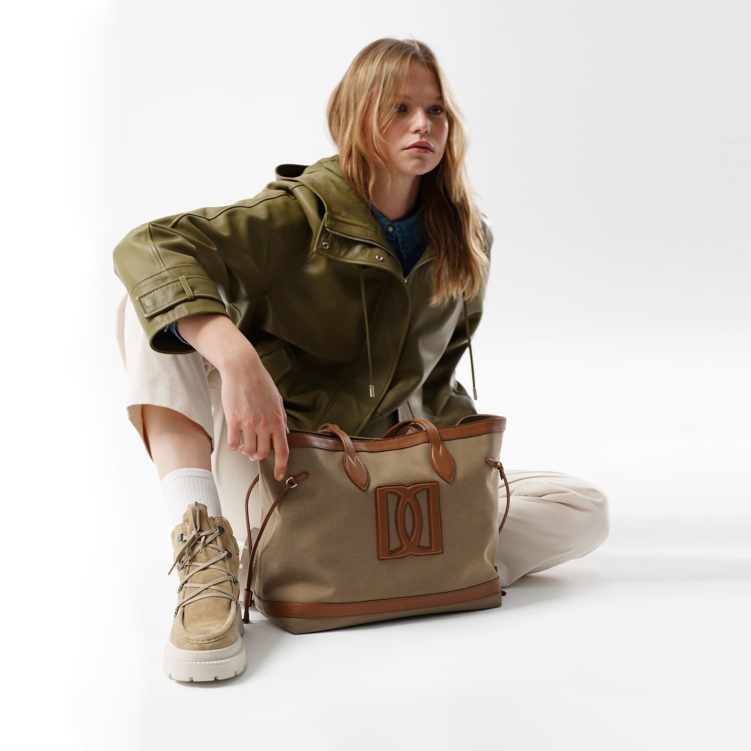 Kumaş ve derinin kombinlendiği kadın omuz çantasıdır. Uzun askısı mevcuttur. Spor ve günlük kıyafetler ile kombinlenebilir. %100 deri ve kanvas kumaş malzemedir. İçerisinde fermuar kapamalı bölmesi vardır. Astarlı çalışılmıştır. Aksesuarların rengi açık altındır. Bu ürün, et endüstrisinin yan ürünü olarak elde edilen ve sürdürülebilir yöntemler ile Leather Working Group Altın sertifikalı Desa tesislerinde tabaklanan deriler kullanılarak üretilmiştir. %100 Dana derisinden üretilmiştir.