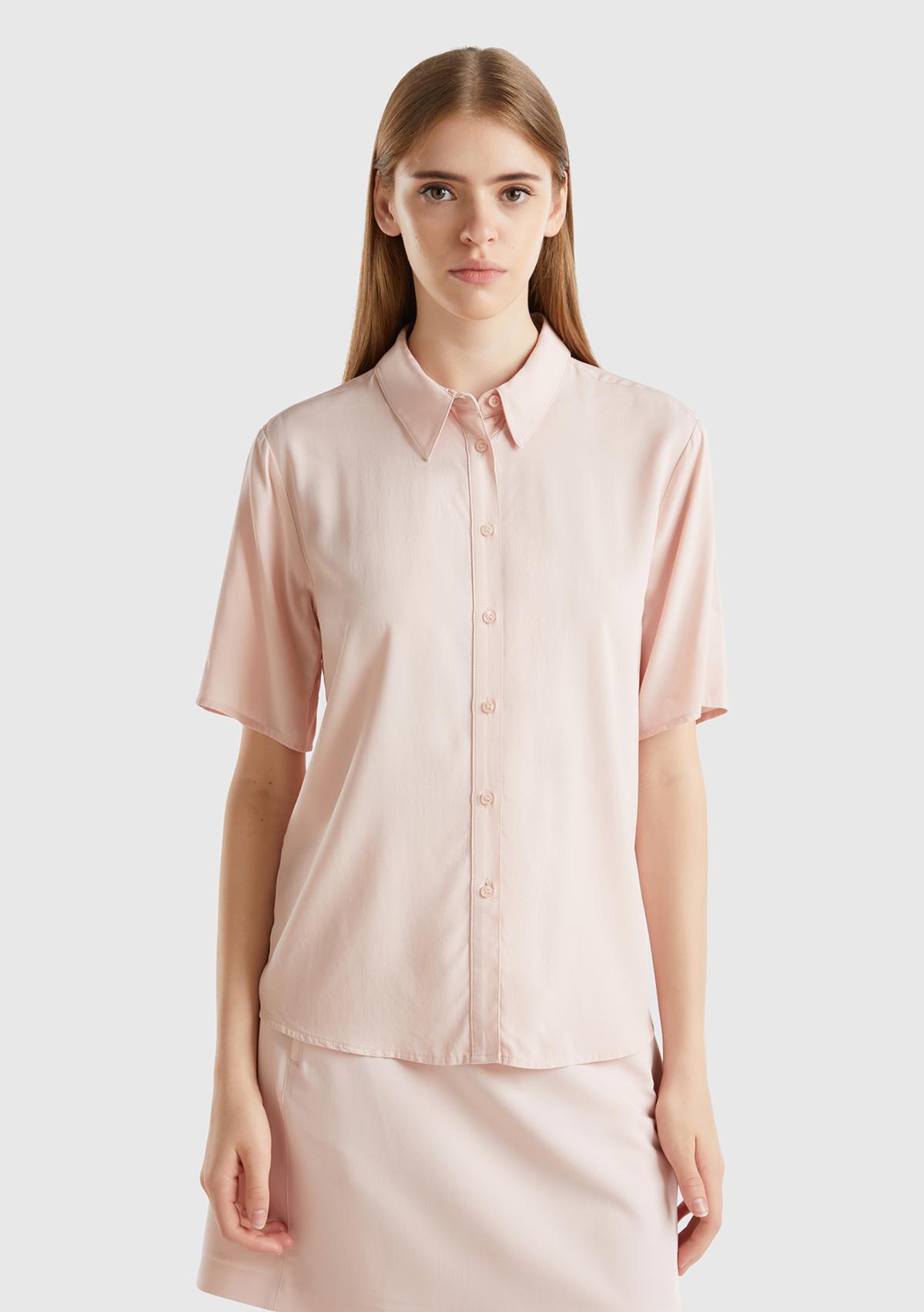 Kadın Toz Pembe %100 Viskoz Yarım Kollu Düz Gömlek