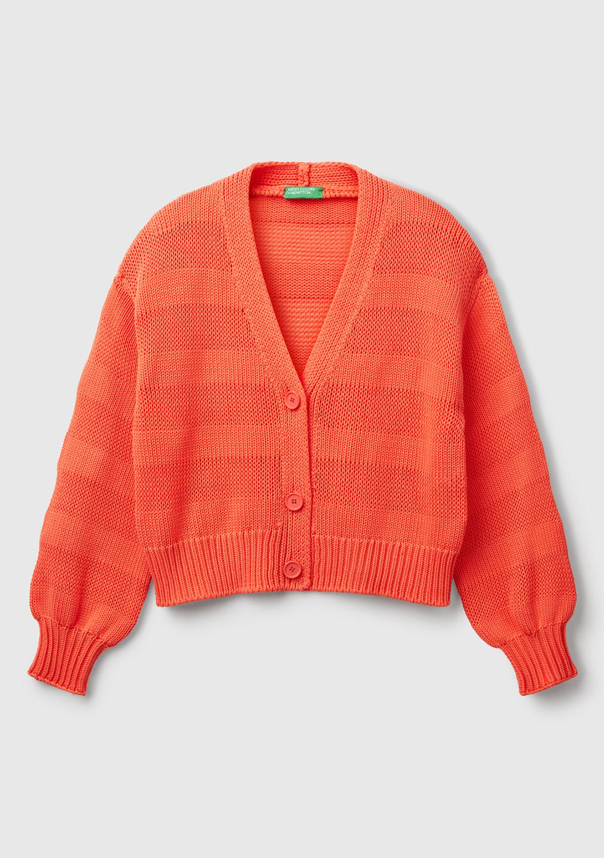 Kadın Turuncu %100 Pamuk Şerit Efektli Düşük Omuzlu Örme Relax Fit Hırka