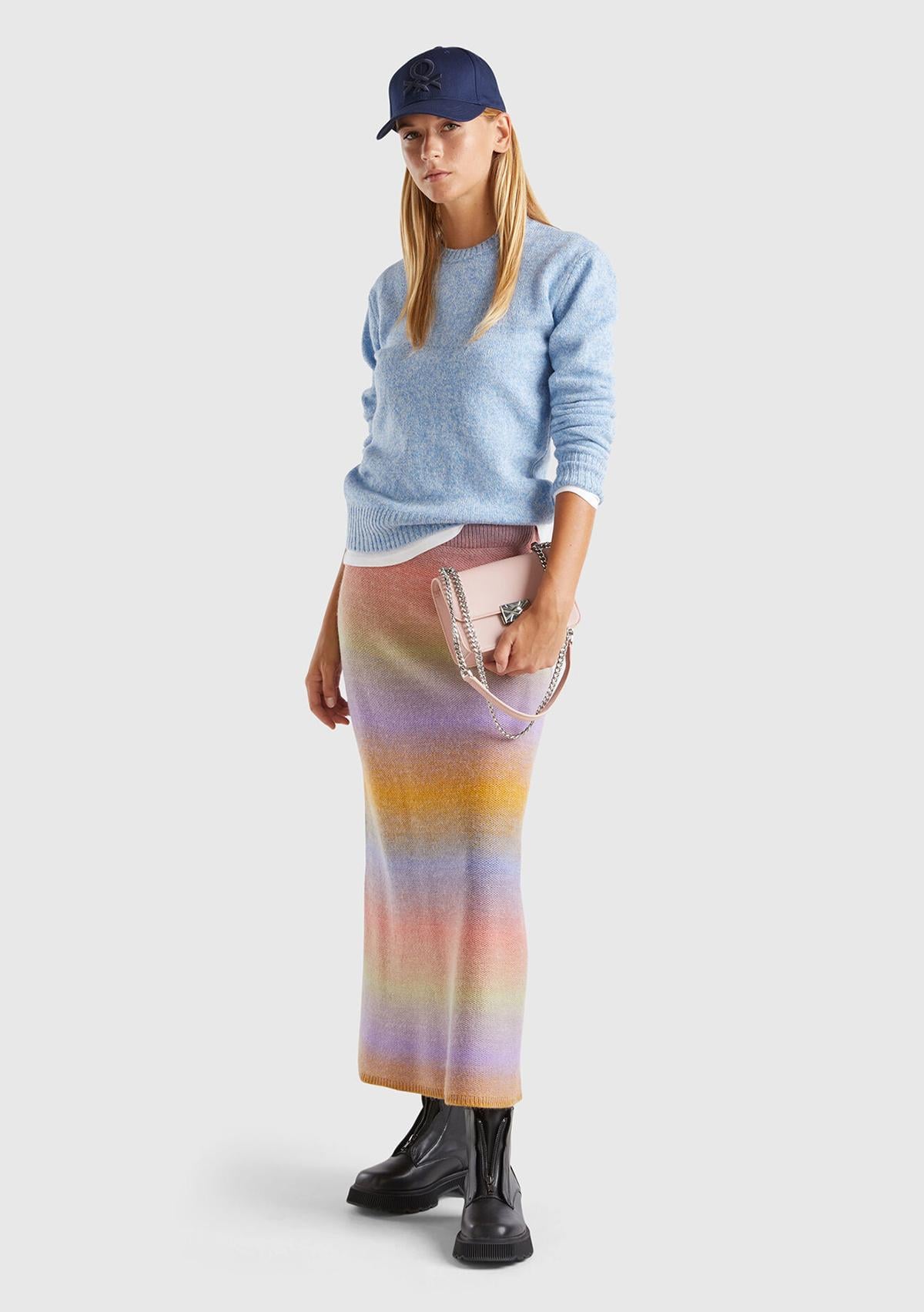 Kadın Turuncu Mix Yün Karışımlı Elastik Belli Çok Renkli Midi Etek. Koyun Yünü İçerir