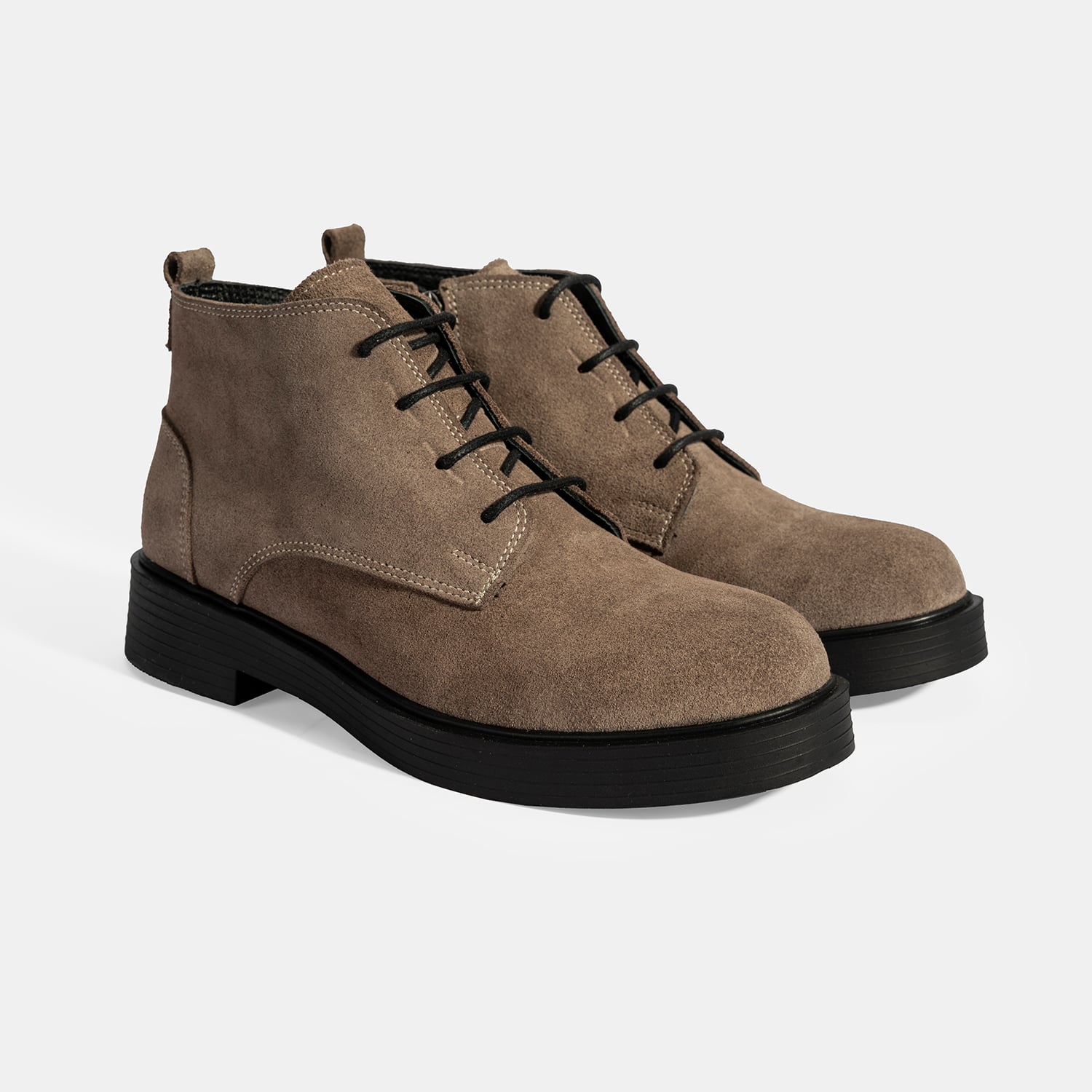 %100 süet deri, deri iç tabanlı, sıcak tekstil astarlı, termo tabanlı, yuvarlak burunlu, bağcıklı kadın günlük bot. Topuk yüksekliği: 3 cm.