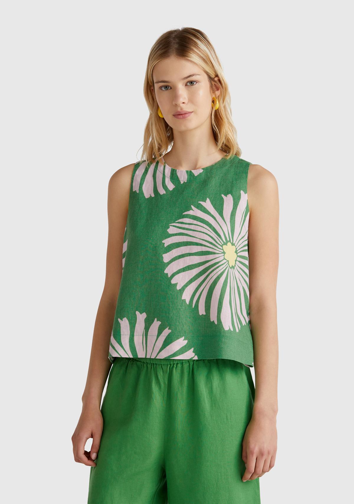 Kadın Yeşil %100 Keten Desenli Kolsuz Bluz