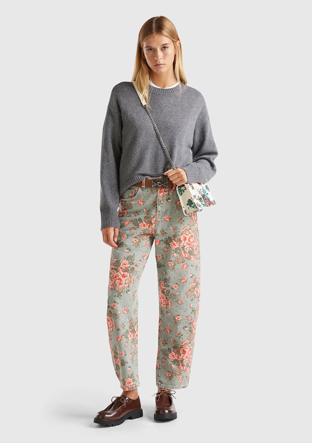 Kadın Yeşil %100 Pamuk Tamamı Çiçek Desenli 5 Cepli Balon Pantolon