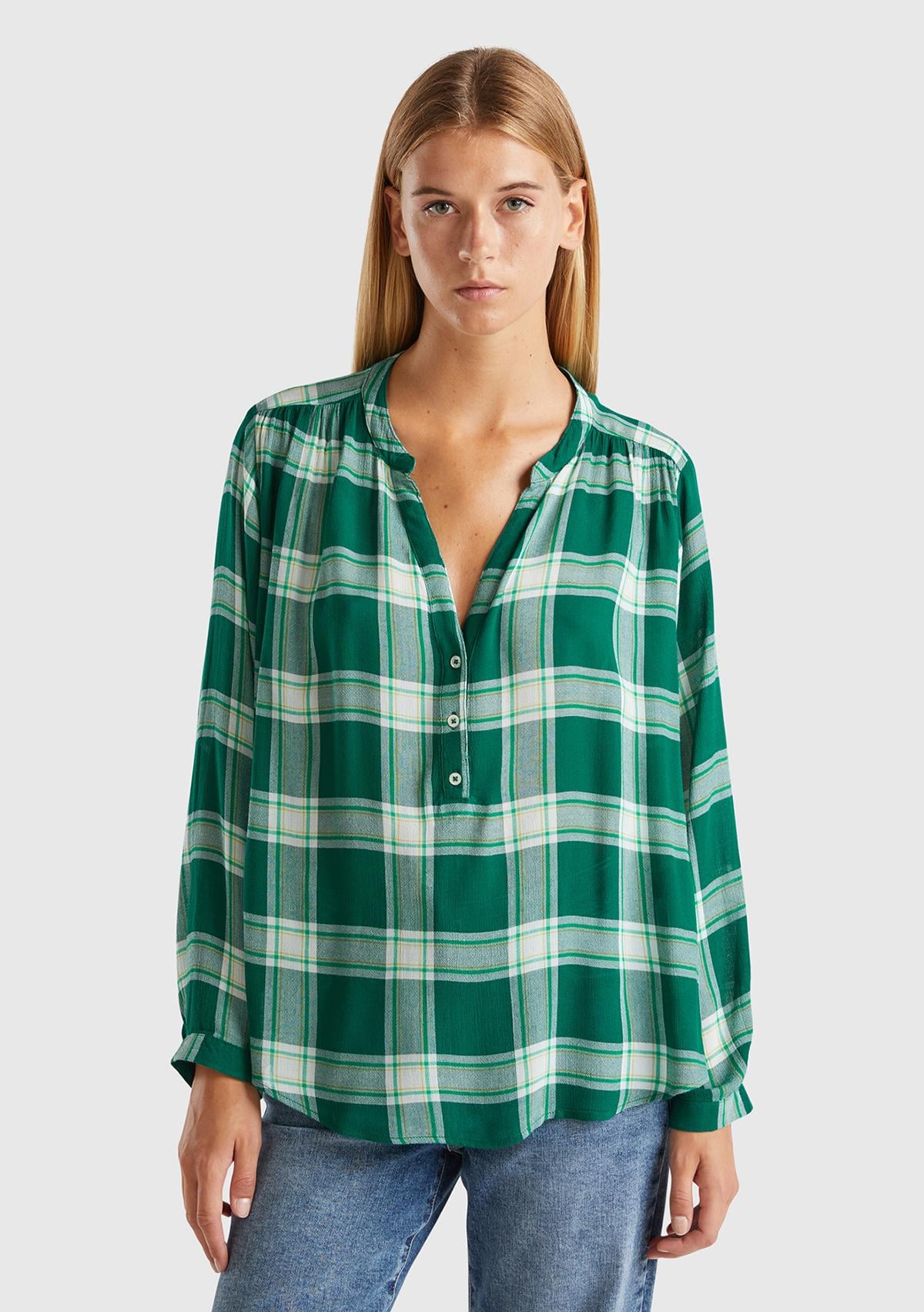 Kadın Yeşil %100 Viskoz Yakası Düğmeli Desenli Truvakar Kol Bluz