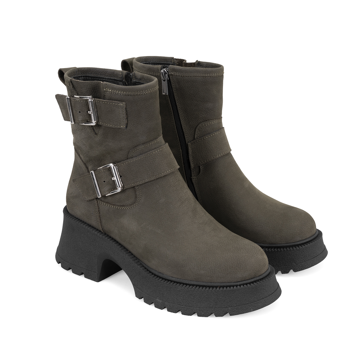 %100 nubuk deri, deri iç tabanlı, tekstil astarlı, termo tabanlı, çift metal toka detaylı, içten fermuarlı, kadın biker bot.