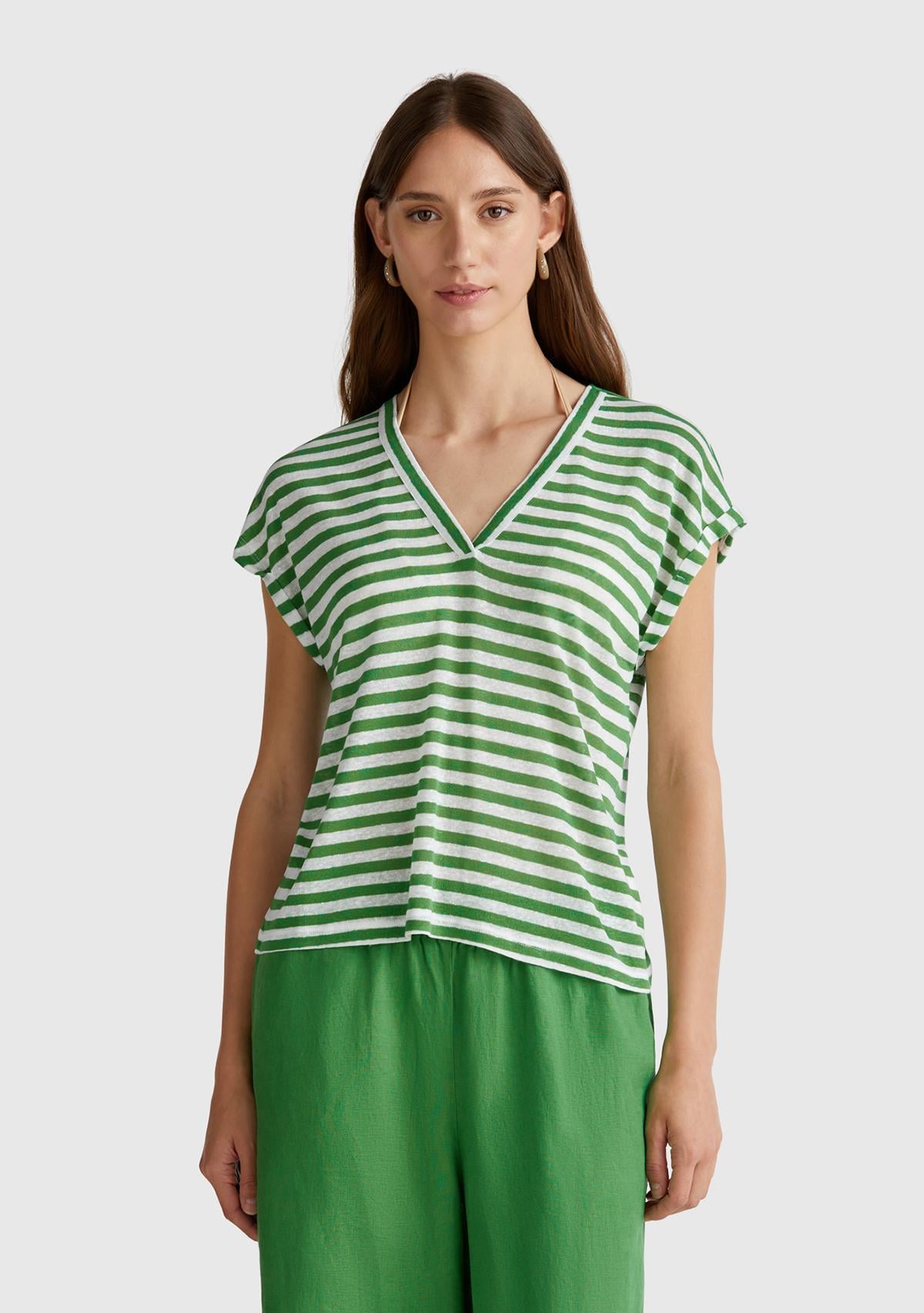 Kadın Yeşil Mix Keten Karışımlı Rahat Kalıp Çizgili V Yaka T-Shirt