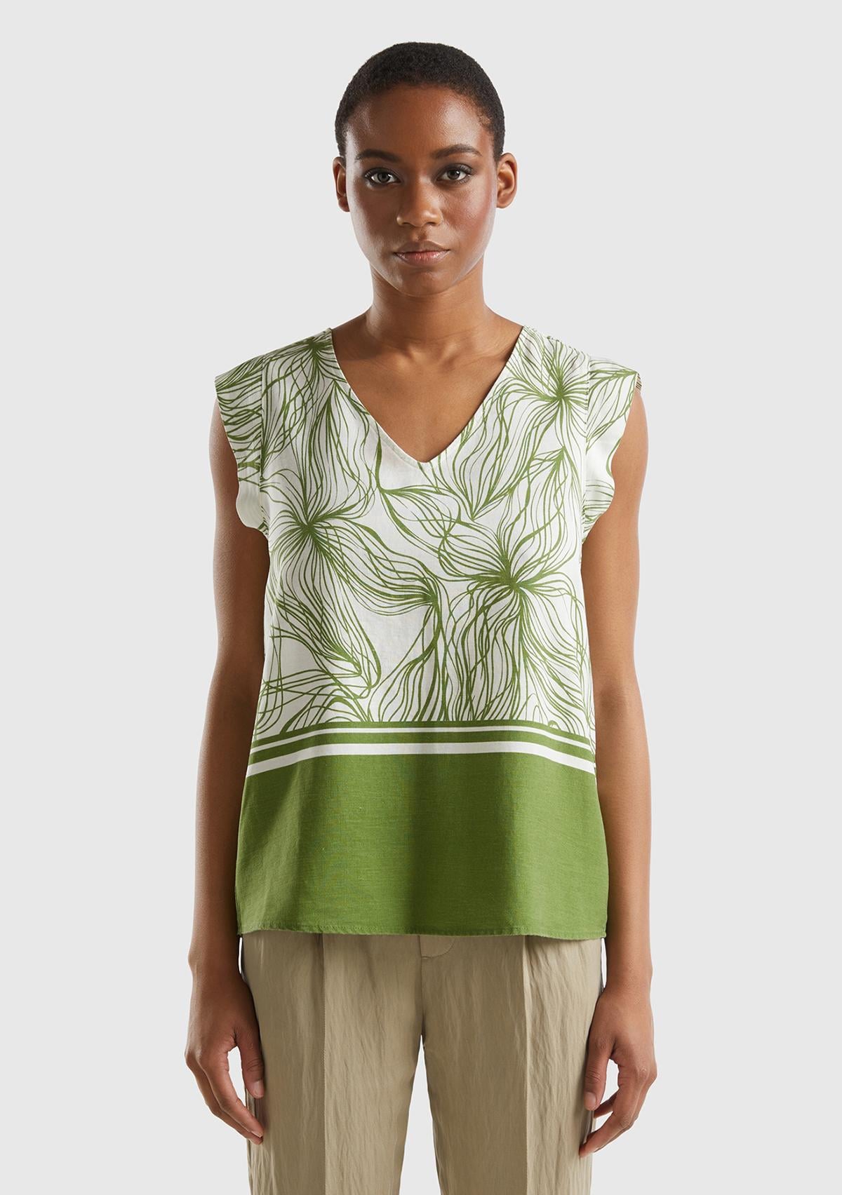 Kadın Yeşil Mix Liyosel ve Keten Karışımlı Baskılı Düz Kesim V Yaka Bluz