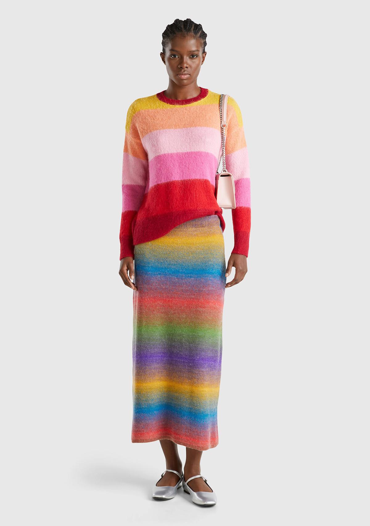 Kadın Yeşil Mix Yün Karışımlı Elastik Belli Çok Renkli Midi Etek. Koyun Yünü İçerir
