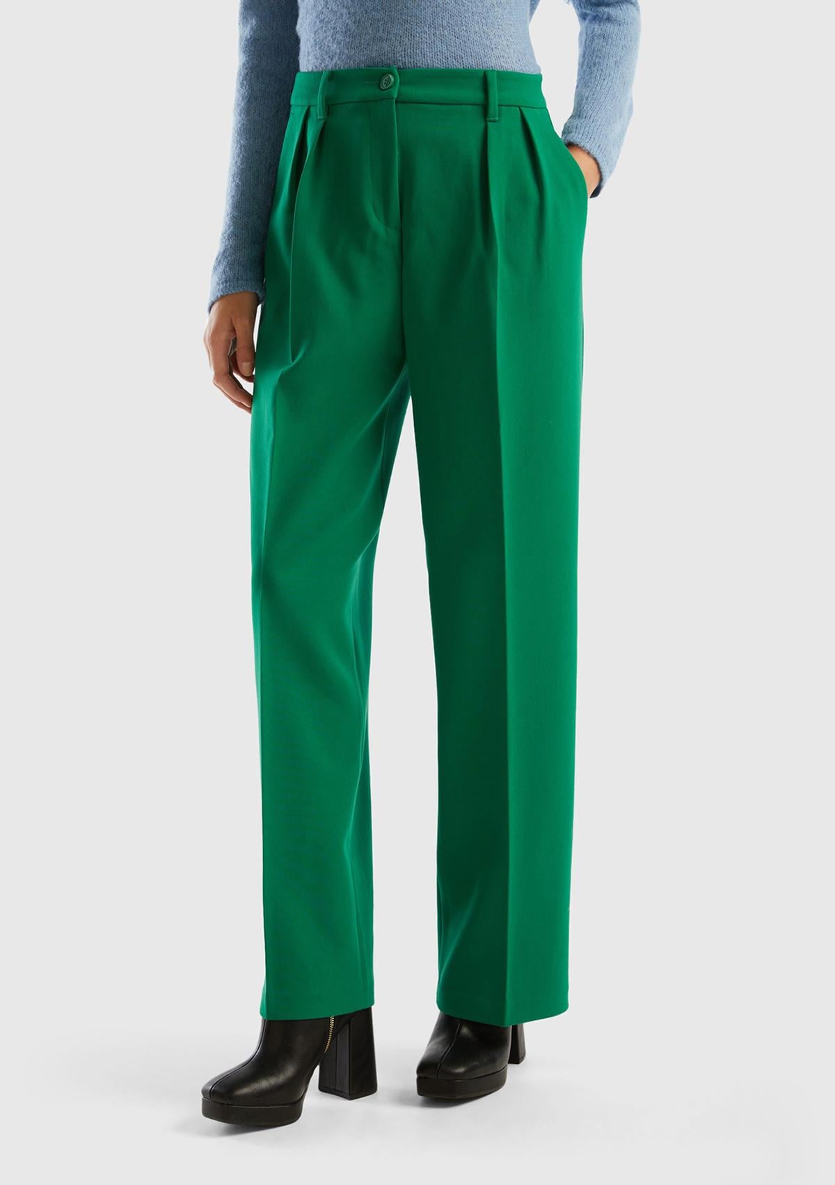 Kadın Yeşil Poliviskoz Bol Paça Pileli Pantolon
