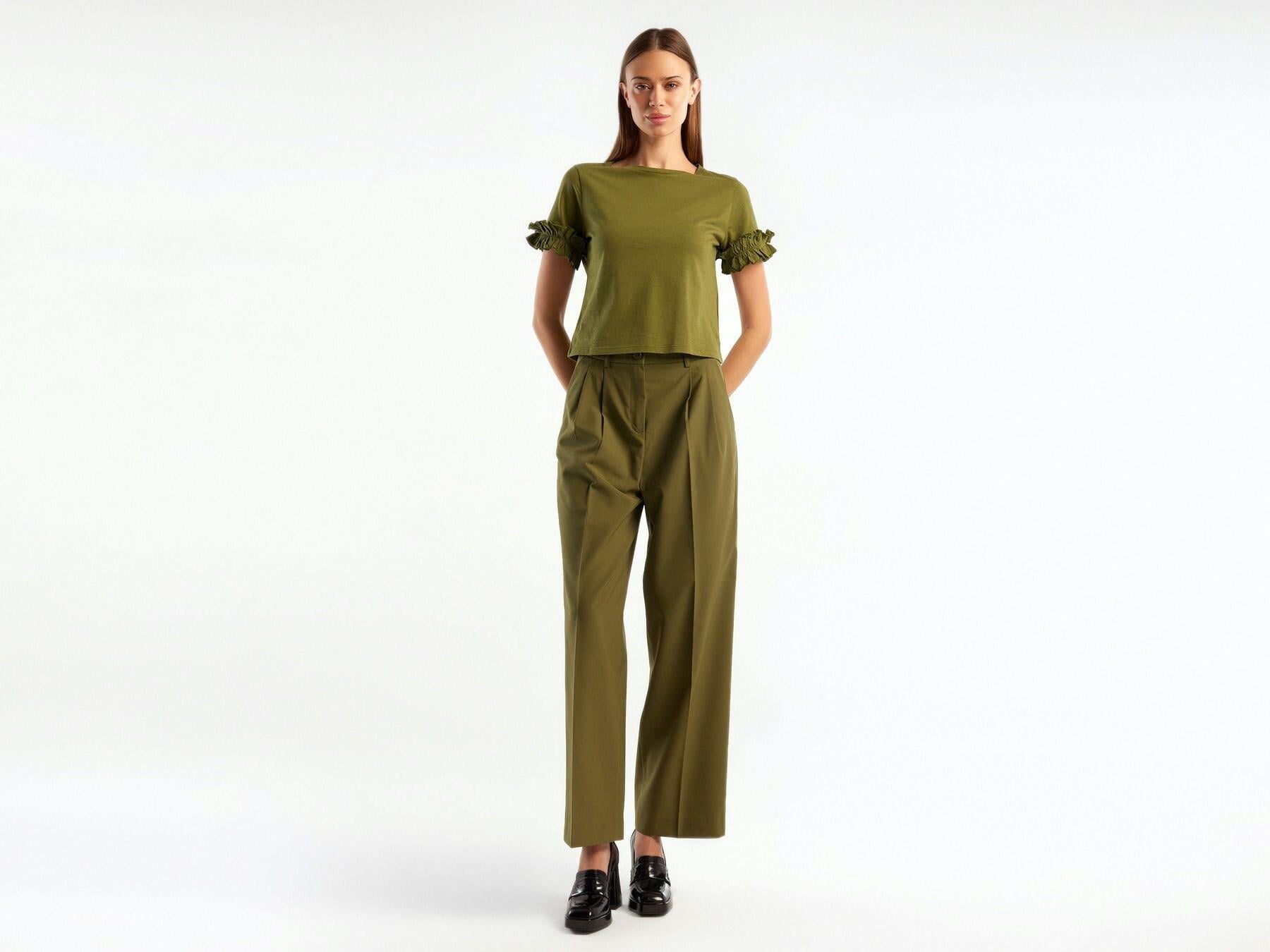 Kadın Zeytin Yeşili %100 Koton Kolu Fırfırlı T-Shirt