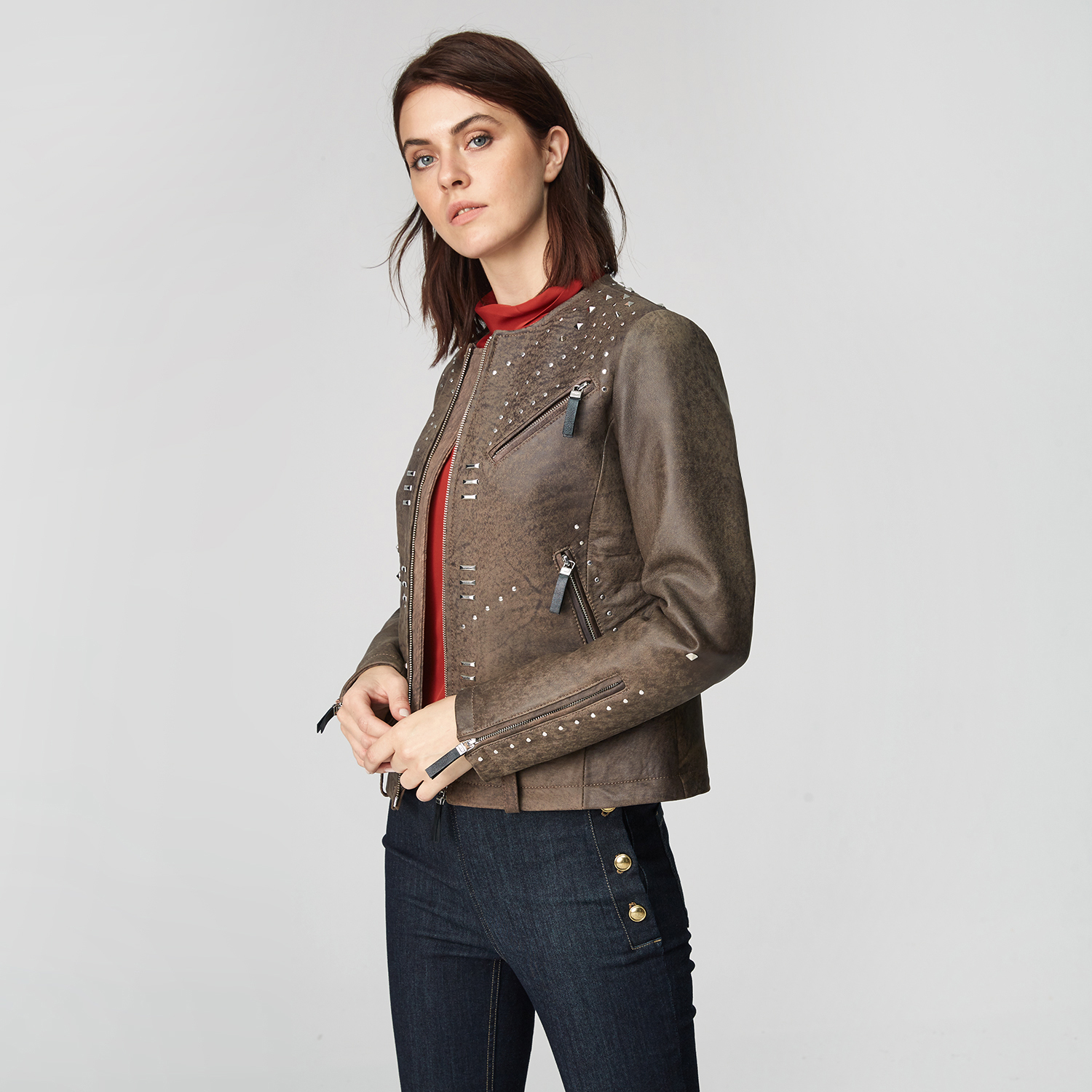 Farklılık seven ve şıklığına önem verenlere kadınlara zımbalı deri mont. Yuvarlak yaka, önden fermuar kapamalı. Bir adet göğüs cebi ve iki adet fermuarlı bel cebi vardır. Kollarında da fermuarı mevcuttur. Model üzerinde zımba ve çıtçıt detayları kullanmıştır. %100 Deri Manken Ölçüleri: 1.78 - 84/61/91