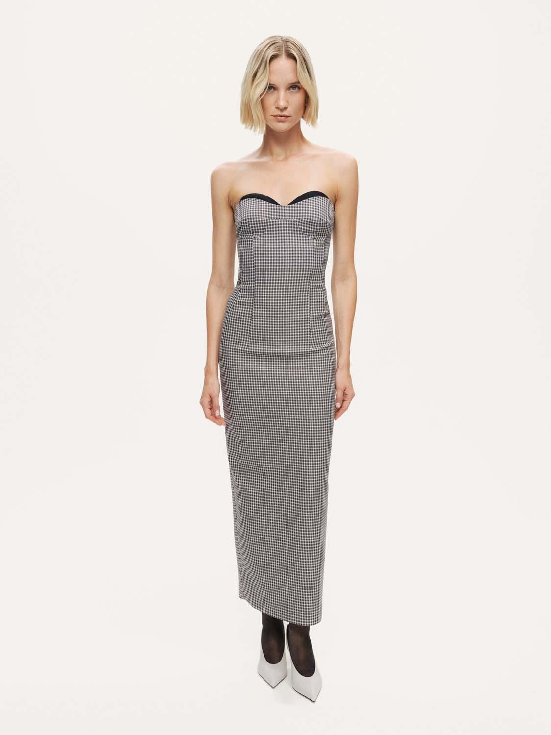 Bu straplez midi elbise, zamansız bir silüetle modern zarafet bir araya geliyor. Göz alıcı kalp yakası ve mikro ekose deseniyle, vücudu saran sütun kesim, doğal hatlarınızı zahmetsiz bir zarafetle vurgular. Yapılı korse, vücuda tam otururken, gizli arka fermuar ve ince sırt yırtmacı zarif hareket özgürlüğü sağlar. Sonbahar davetleri, şehir geceleri veya şık günlük kat kat giysiler için mükemmeldir. Kalıp: Slim Fit Beden Önerisi: Kendi bedeninizi tercih etmenizi tavsiye ederiz. Model Ürün Bedeni: S Model Bedeni: Boy 1.77 / Göğüs 82 cm / Bel 61 cm / Kalça 89 cm
