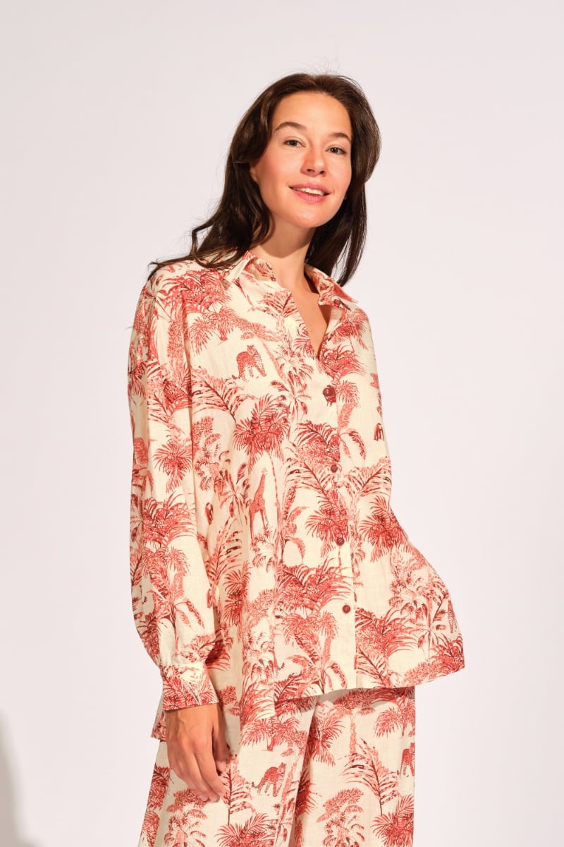 Gömlek yaka, yanları yırtmaç detaylı, dijital baskılı keten gömlek.%69 Cotton %31 LinenBu ürünü 30 derecede, benzer renklerle, tersten yıkayınız ve gölgede kurutunuz. Baskı veya nakış olan bölgeye ütü temas ettirmeyiniz, bu bölge tersten ütülenebilir.