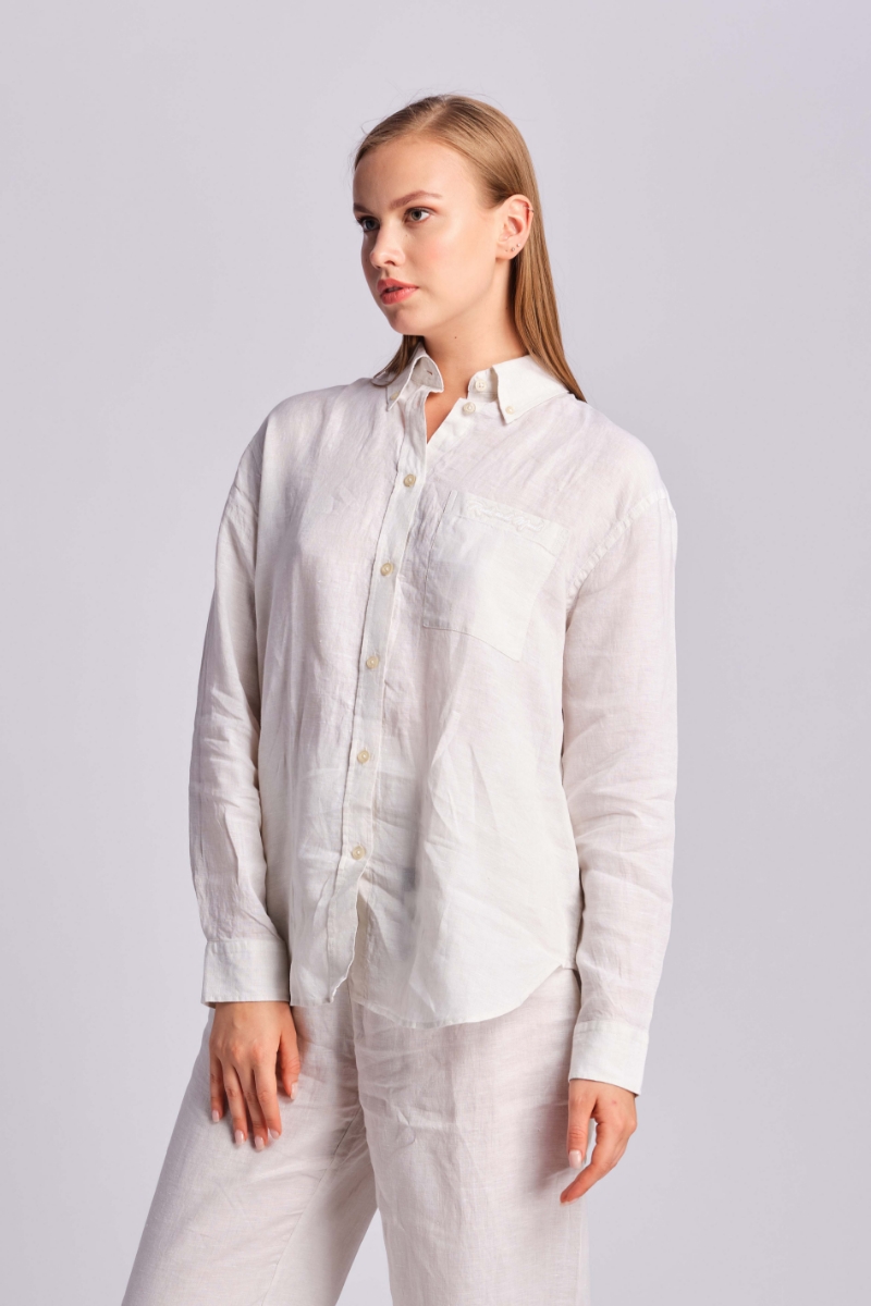 Gömlek yaka, nakış detaylı keten gömlek.%100 LinenBu ürünü 30 derecede, benzer renklerle, tersten yıkayınız ve gölgede kurutunuz. Baskı veya nakış olan bölgeye ütü temas ettirmeyiniz, bu bölge tersten ütülenebilir.