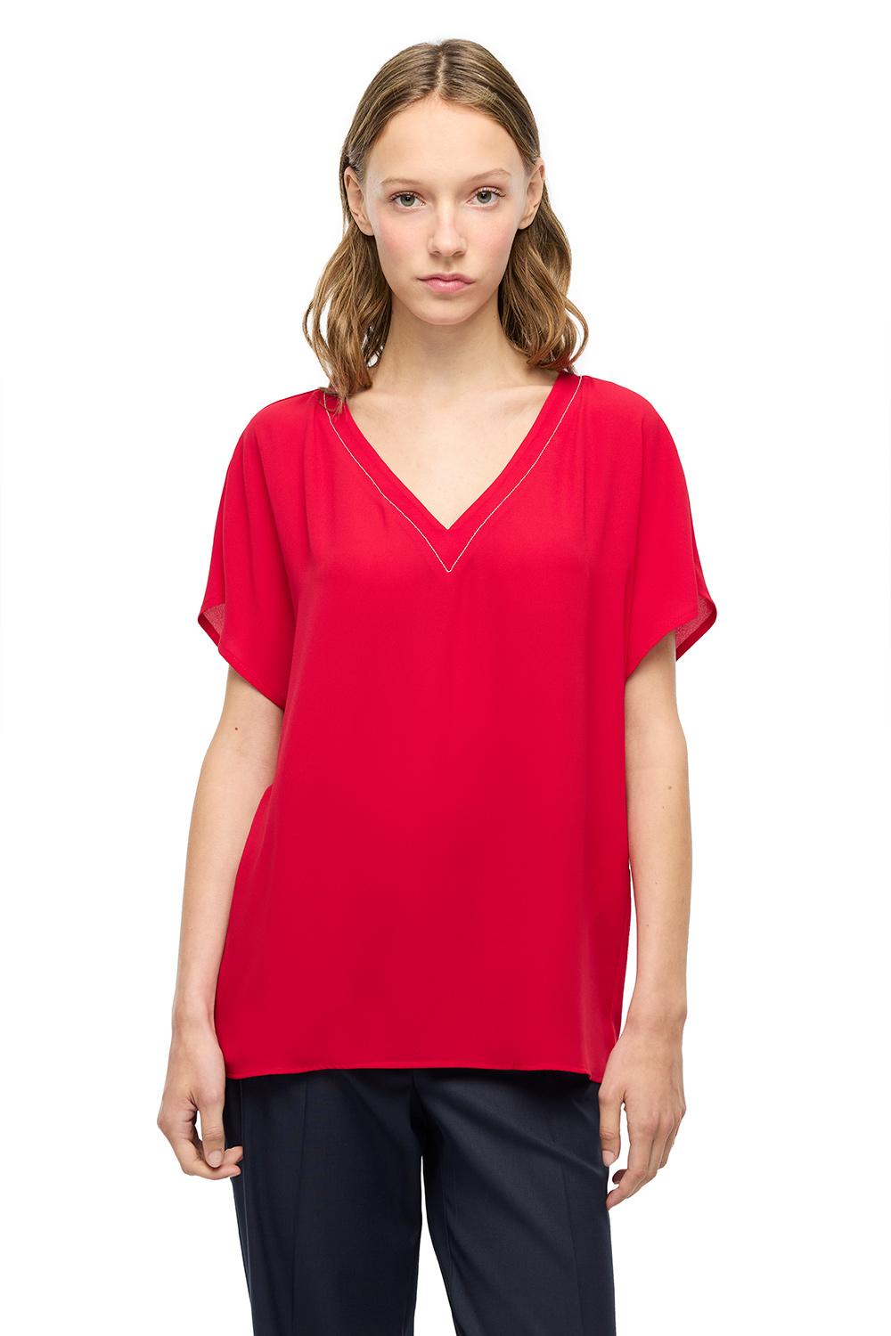 Kırmızı Ametist Rahat Kalıp V-Yaka Bluz