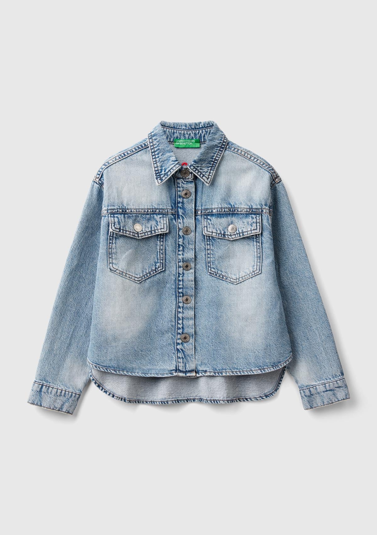 Kız Çocuk Açık Denim Arkası Logo Detaylı Göğüs Cepli Önü Kısa Gömlek