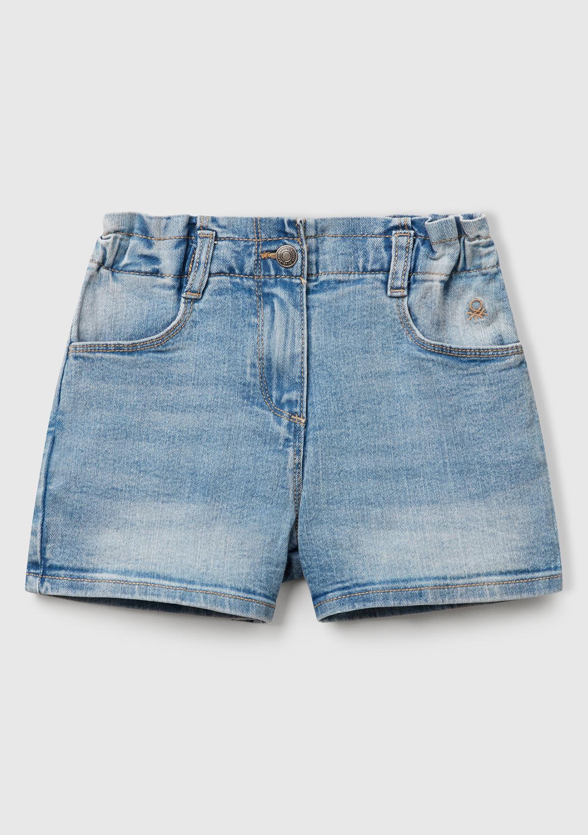 Kız Çocuk Açık Denim Logolu Taş Yıkama Beli Lastikli Streç Denim Şort